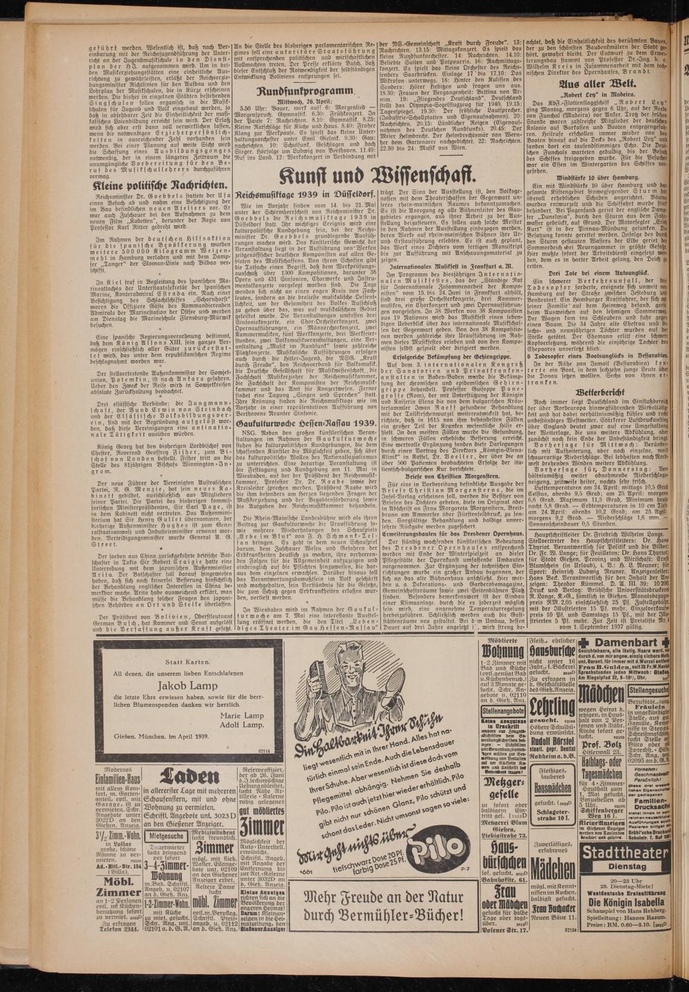 Hauptschriftleiter Dr. Friedrich Wilhelm Lange. Stellvertreter des Hauptschriftleiters: Dr. Hans Thyriot. Verantwortlich für Politik und die Bilder: Dr. Fr. W. Lange; für Feuilleton: Dr. Hans Thyriot; für Stadt Gießen, Provinz und Wirtschaft: Ernst Blumschein (in Urlaub), i. V.: H. L. Neuner; für Sport: Heinrich Ludwig Neuner. Anzeigenleiter: Hans Beck. Verantwortlich für den Inhalt der An« zeigen: Theodor Kümmel. D. A. III. 39: 10 200. Druck und Verlag: Brühlsche Universitätsdruckerei R. Lange, K.-G., sämtlich in Gießen. Monatsbezugs« preis RM. 2,05 einschließlich 25 Pf. Zustellgebühr, mit der Illustrierten 15 Pf. mehr. Einzelverkaufs' preis 10 Pf. und Samstags 15 Pf., mit der Illustrierten 5 Pf. mehr. Zur Zeit ist Preisliste !RrJ vom 1. September 1937 gültig.