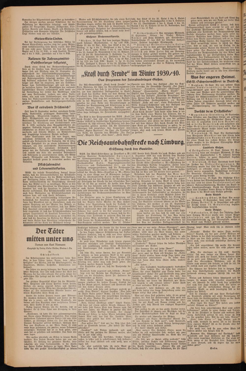 1937 konnte diese Strecke bis? nach Gießen und am 4. Dezember 1938 bis nach Alsfeld dem Verkehr übergeben werden. „Am heutigen Tage", so fuhr der Gauleiter fort, „würden nunmehr 45 Kilometer der Strecke Köln—Frankfurt a. M.—Würzburg für den öffentlichen Verkehr freigegeben. Damit seien im Gau Hessen-Nassau insgesamt 217 Kilometer Reichsautobahn fertiggestellt. 101 Kilometer befänden sich im Bau und 150 weitere seien geplant."