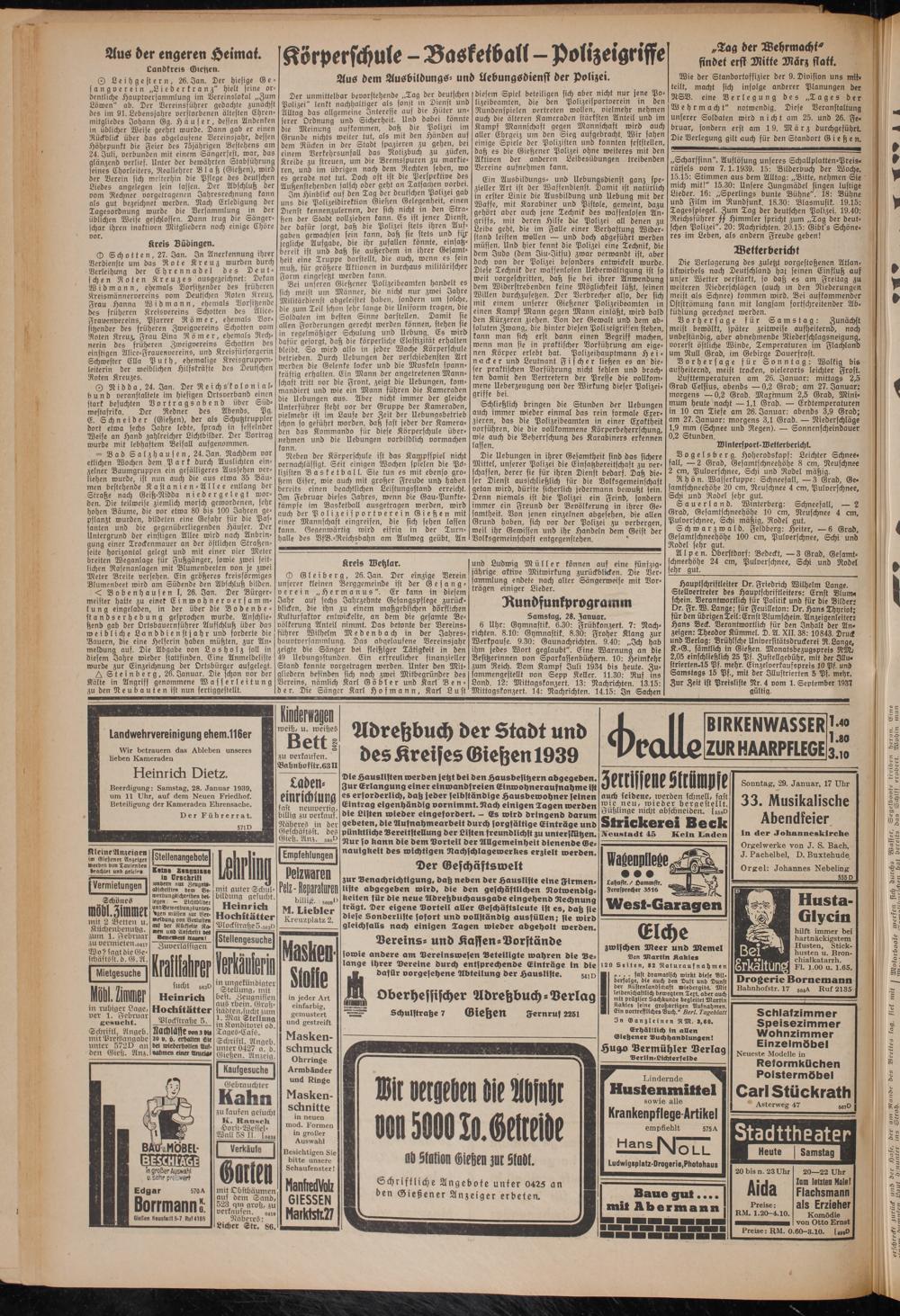 Hauptschriftleiter vr. Friedrich Wichelm Lange. Stellvertreter des Hauptschriftleiters: Ernst 93lum« schein. Verantwortlich für Politik und für die Silber; Dr. Fr. W. Lange; für Feuilleton: Dr. Hans Thyriot; für Öen übrigen Teil: Ernst Blumschein. Anzeigenleiterr Hans Beck. Verantwortlich für den Inhalt der An« zeigen: Theodor Kümmel. D. A. XII. 38: 10843. Druck und Verlag: Brühlsche Hniversitätsdruckerei R. Lange, K.-G., sämtlich in Gießen. Monatsbezugspreis RM.' 2,05 einschließlich 25 Pf. Zustellgebühr, mit der 3Hu« ftrierten-15 Pf. mehr. Einzeloerkaufspreis 10 Pf. und Samstags 15 Pf., mit der Illustrierten 5 Pf. mehr. Zur Zeit ist Preisliste Nr. 4 vom 1. September 1937 gültig.