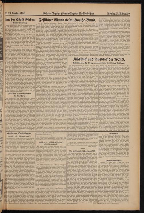 Oberbürgermeister Ritter dankte für die erwiesene Ehre, sprach dann in nachhaltigen Worten der Anerkennung von der Wertschätzung, die der Goethe-Bund und sein Wirken in Gießen und in breitem Umkreis genießen, und sagte auch für die Zukunft alle Förderung der Bestrebungen des Goethe-Bundes zu.