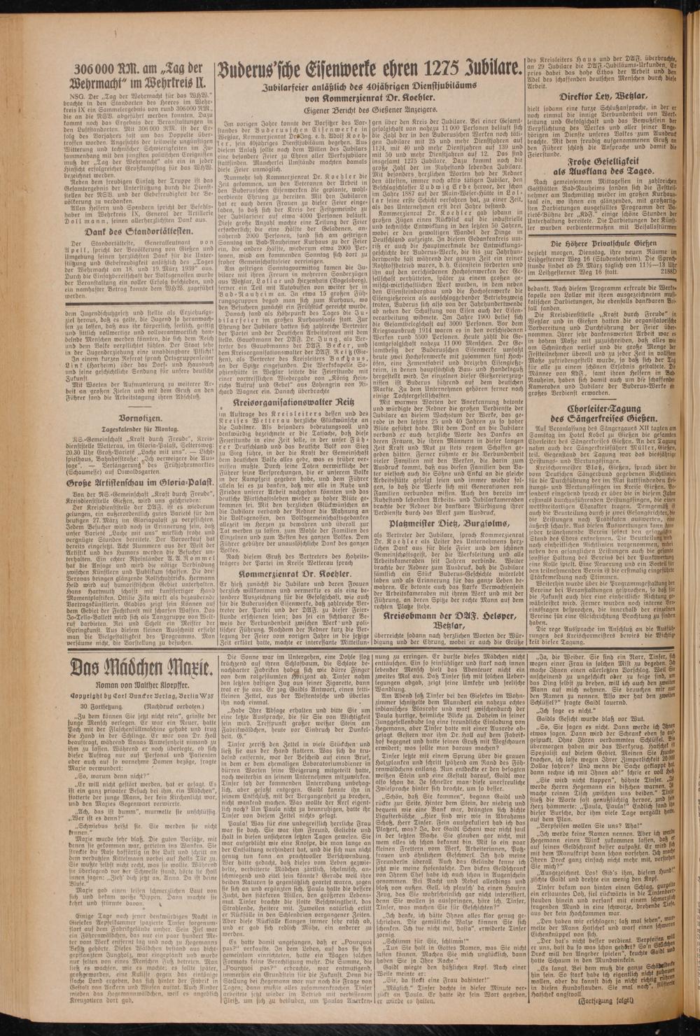 Nunmehr sah Kommerzienrat Dr. Koehler die Zeit gekommen, um den Veteranen der Arbeit in den Buderusschen Eisenwerken die geplante, wohlverdiente Ehrung zu bereiten. Mit den J-ubilaren hat er auch deren Frauen zu dieser Feier eingeladen, so daß sich der Kreis der Festgemeinde zu der Jubilarseier auf etwa 4000 Personen beläuft. Diese große Anzahl machte eine Teilung der Feier erforderlich: die eine Hälfte der Geladenen, annähernd 2000 Personen, fand sich am gestrigen Sonntag im Bad-Nauheimer Kurhaus zu der Feier ein, die andere Hälfte, wiederum etwa 2000 Personen, wird am kommenden Sonntag sich dort zu froher Gemeinschaftsfeier vereinigen.