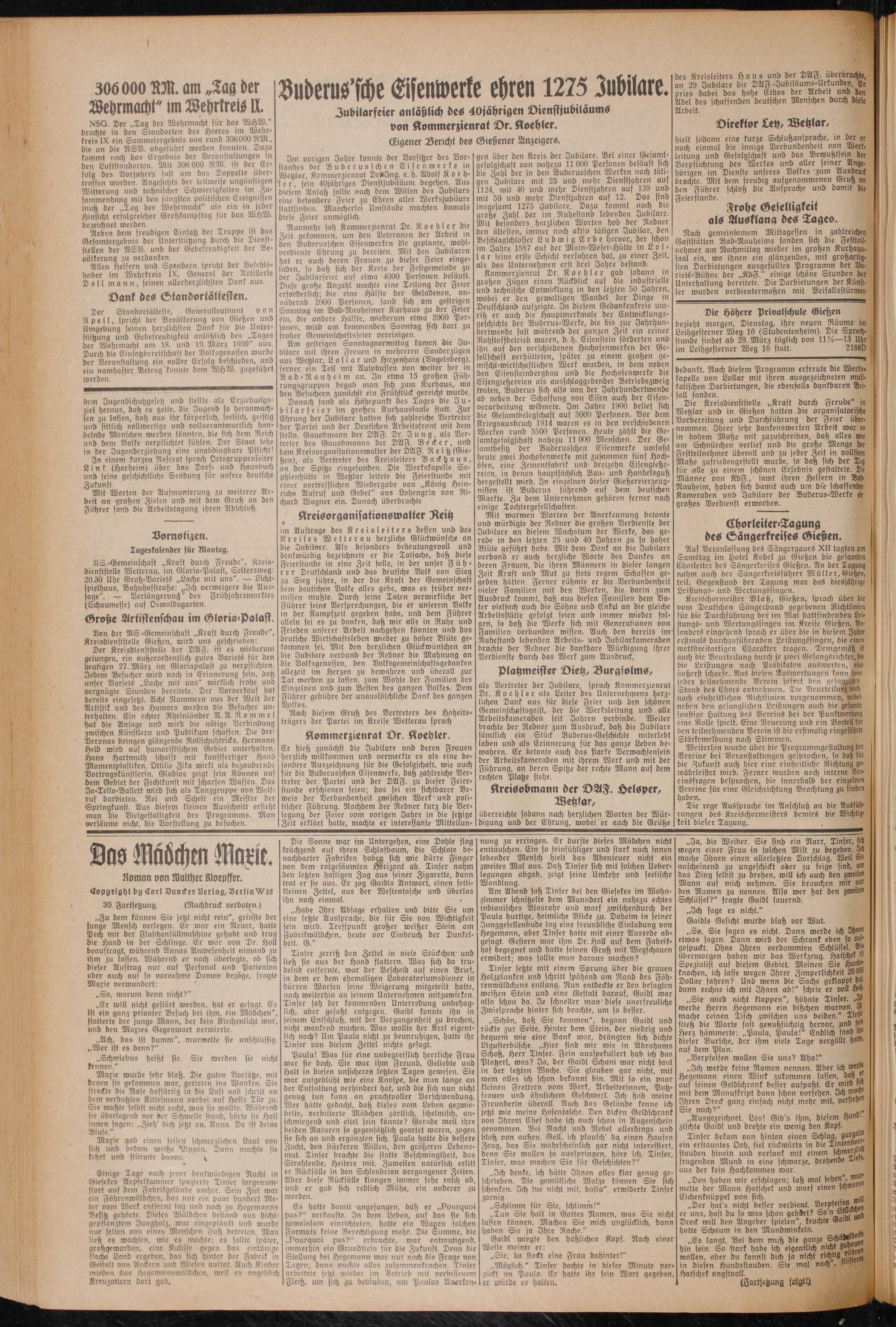 Im vorigen Jahre konnte der Vorsitzer des Vorstandes der B u d e r u s s ch e n Eisenwerke in Wetzlar, Kommerzienrat DrckJng. e. h. Adolf Koehler, sein 40jähriges Dienstjubiläum begehen. Aus diesem Anlaß sollte nach dem Willen des Jubilars eine besondere Feier zu Ehren aller Werksjubilare stattfinden. Mancherlei Umstände machten damals diese Feier unmöglich.