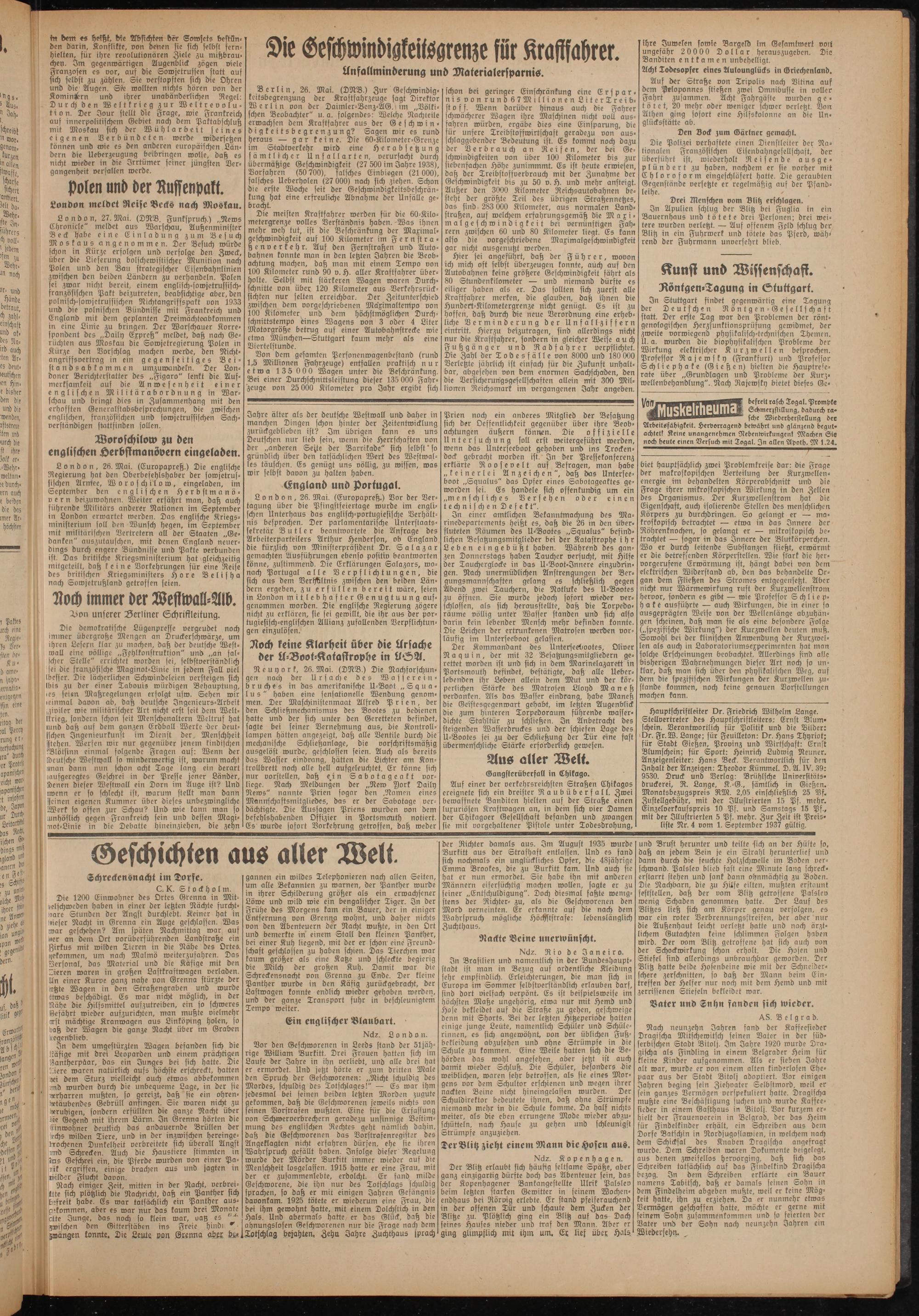 Hauptschriftleiter Dr. Friedrich Wilhelm Lange. Stellvertreter des Hauptschriftleiters: Ernst Blum« schein. Verantwortlich für Politik und die Bilder: Dr. Fr.W. Lange; für Feuilleton: Dr. Hans Thyriot; für Stadt Gießen, Provinz und Wirtschaft: Ernst Blumschein; für Sport: Heinrich Ludwig Neuner. Anzeigenleiter: Hans Beck. Verantwortlich für den Inhalt der Anzeigen: Theodor Kümmel. D. A. IV. 39: 9530. Druck und Verlag: Bn'ihlsche Universitätsdruckerei, R. Lange, K.-G., sämtlich in Gießen. Monatsbezugspreis RM. 2,05 einschließlich 25 Vf. Zustellgebühr, mit der Illustrierten 15 Pf. mehr. Einzelverkaufspreis 10 Pf. und Samstags 15 Pf., mit der Illustrierten 5 Pf. mehr. Zur Zeit ist Preisliste Nr. 4 vom 1. September 1937 gültig.