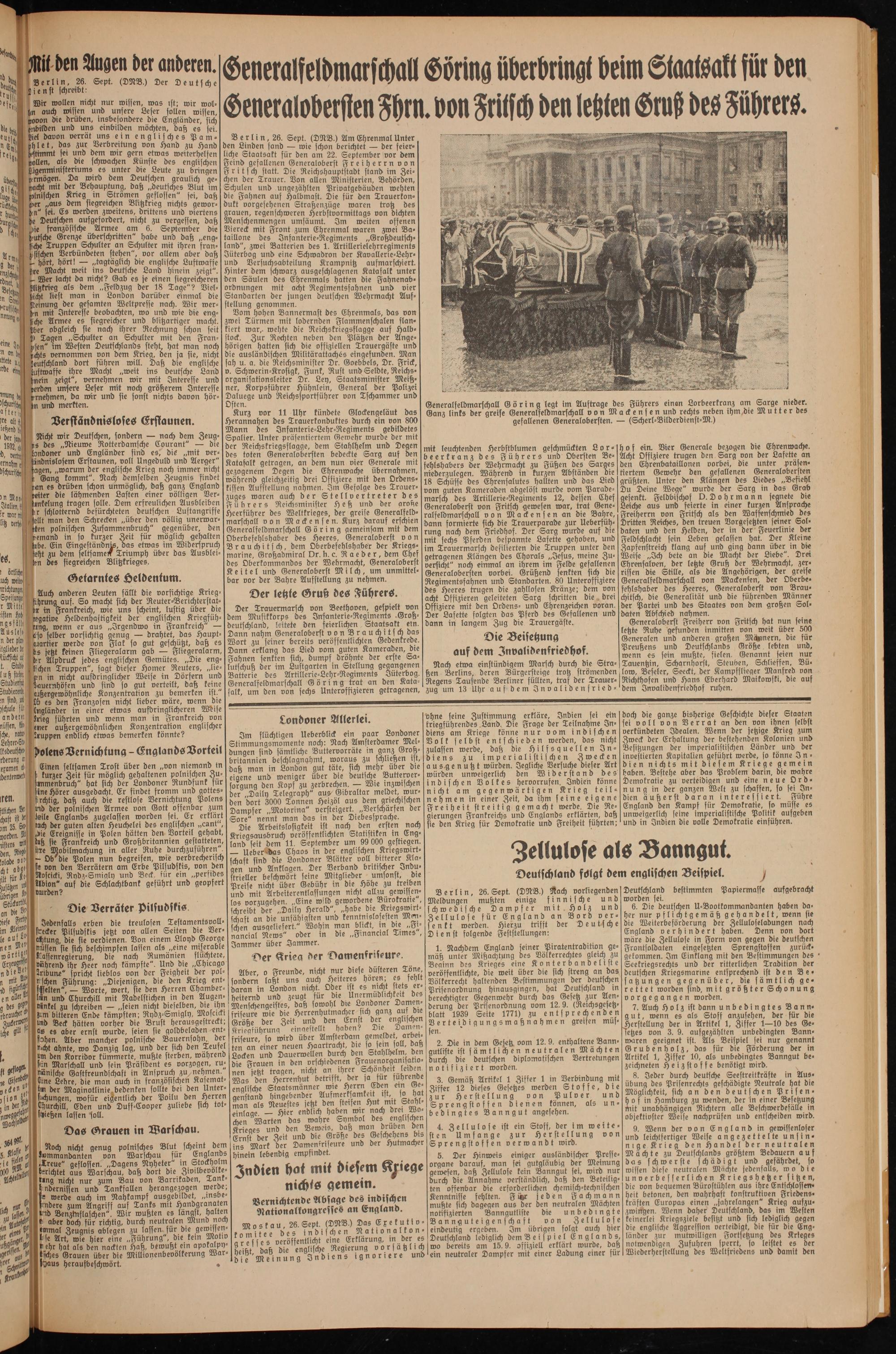 Berlin, 26. Sept. (DNB.) Am Ehrenmal Unter den Linden fand — wie schon berichtet — der feierliche Staatsakt für den am 22. September vor dem Feind gefallenen Generaloberst Freiherrn von Fritsch statt. Die Reichshauptstadt stand im Zeichen der Trauer. Von allen Ministerien, Behörden, Schulen und ungezählten Privatgebäuden wehten die Fahnen auf Halbmast. Die für den Trauerkondukt vorgesehenen Straßenzüge waren trotz des grauen, regenschweren Herbstvormittags von dichten Menschenmengen umsäumt. Im weiten offenen Viereck mit Front zum Ehrenmal waren zwei Bataillone des Infanterie-Regiments „Großdeutschland", zwei Batterien des 1. Artillerielehrregiments Jüterbog und eine Schwadron der Kavallerie-Lehr- und Dersuchsabtetlung Krampnitz aufmarschiert. Hinter dem schwarz ausgeschlagenen Katafalk unter den Säulen des Ehrenmals hatten die Fahnenabordnungen mit acht Regimentsfahnen und vier Standarten der jungen deutschen Wehrmacht Aufstellung genommen.