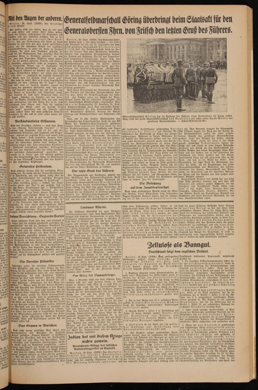 Kurz vor 11 Uhr kündete Glockengeläut das Herannahen des Trauerkonduktes durch ein von 800 Mann des Jnfanterie-Lehr-Regiments gebildetes Spalier. Unter präsentiertem Gewehr wurde der mit der Reichskriegsflagge, dem Stahlhelm und Degen des toten Generalobersten bedeckte Sarg auf den Katafalk getragen, an dem nun vier Generale mit gezogenem Degen die Ehrenwache übernahmen, während gleichzeitig drei Offiziere mit den Ordenskissen Aufstellung nahmen. Im Gefolge des Trauerzuges waren auch der Stellvertreter des Führers Reichsminister Heß und der aroße Heerführer des Weltkrieges, der greise Generalfeldmarschall von Mackensen. Kurz darauf erschien Generalfeldmarschall Göring gemeinsam mit dem Oberbefehlshaber des Heeres, Generaloberst von Braucht tsch, dem Oberbefehlshaber der Kriegsmarine, Großadmiral Dr. h. c. Raeder, dem Chef des Oberkommandos der Wehrmacht, Generaloberst Keitel und Generaloberst Milch, um unmittelbar vor der Bahre Aufstellung zu nehmen.
