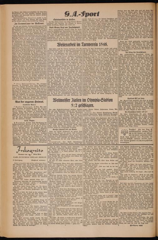 Der achte Fußballänderkampf zwischen Deutsch- lcnck und dem Weltmeister Italien, der am Sonntag vor 90 000 Besuchern hn Berliner Olympia- Stadion vor sich ging, gestaltete sich zu einem eindrucksvollen deutschen Triumph. Mit 5:2 Toren wurde der Weltmeister geschlagen, nachdem man bei der Pcrüse noch einen Stand von 2:2 notiert hatte. Die deutsche Elf lieferte trotz der ungünstigen Bodenverhältnisse ein ausgezeichnetes Spiel, und erfreulicherweise wurden alle Erwartungen, die man in die neue deutsche Stürmerreihe gesetzt hatte, restlos erfüllt Der Wiener Binder war mit drei Treffern wieder der erfolgreichste Torschütze.
