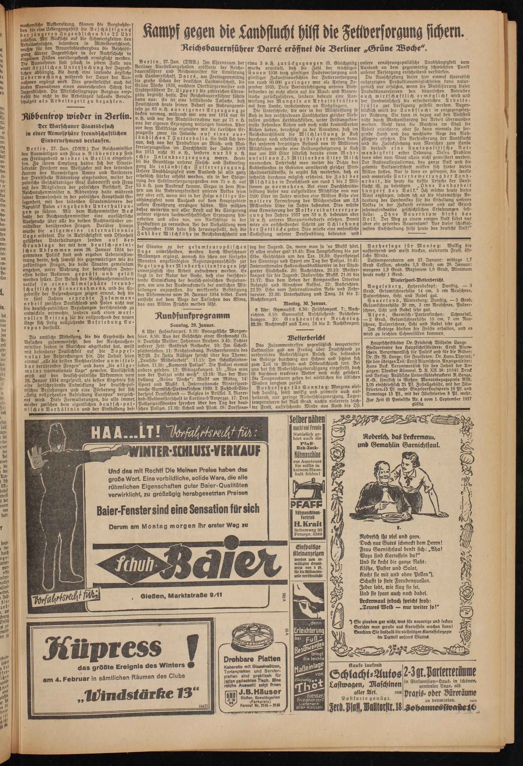 Hauptschriftleiter Dr. Friedrich Wilhelm Lange. Stellvertreter des Hauptschriftleiters: Ernst Blumschein. Verantwortlich für Politik und für die Bilder: Dr. Fr. W. Lange; für Feuilleton: Dr. Hans Thyriot; für den übrigen Teil: Ernst Blumschein. Anzeigenleiter: Hans Beck. Verantwortlich für den Inhalt der Anzeigen: Theodor Kümmel. D. A. XII. 38: 10843. Druck und Verlag: Brühlsche Universitätsdruckerei R. Lange, K.-G., sämtlich in Gießen. Monatsbezugspreis RM. 2,05 einschließlich 25 Pf. Zustellgebühr, mit der Jllu- ftrierten-15 Pf. mehr. Einzelverkaufspreis 10 Pf. und Samstags 15 Pf., mit der Illustrierten 5 Pf. mehr. Zur Zeit ist Preisliste Nr. 4 vom 1. September 1937 gültig