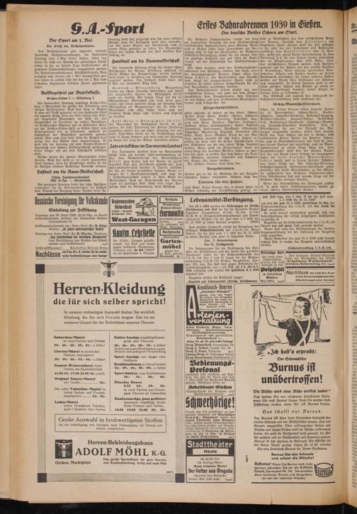 Das Reichssportamt gibt folgendes bekannt: Sportliche Großveranstaltungen am Nationalen Feiertag, dem 1. Mm, dieses Jahres, fallen aus, sofern sie nicht auf Wunsch der zuständigen Dienststellen in die an diesem Tage stattsindenden allgemeinen Festveranstaltungen eingegliedert werden. Die Vereinsoeranstaltungen, Gesellschaftsspiele, Rundenspiele usw. können am 1. Mai durchgeführt werden, sofern sie zeitlich nicht mit den am 1. Mai stattfindenden allgemeinen örtlichen Feiern zusammenfallen.
