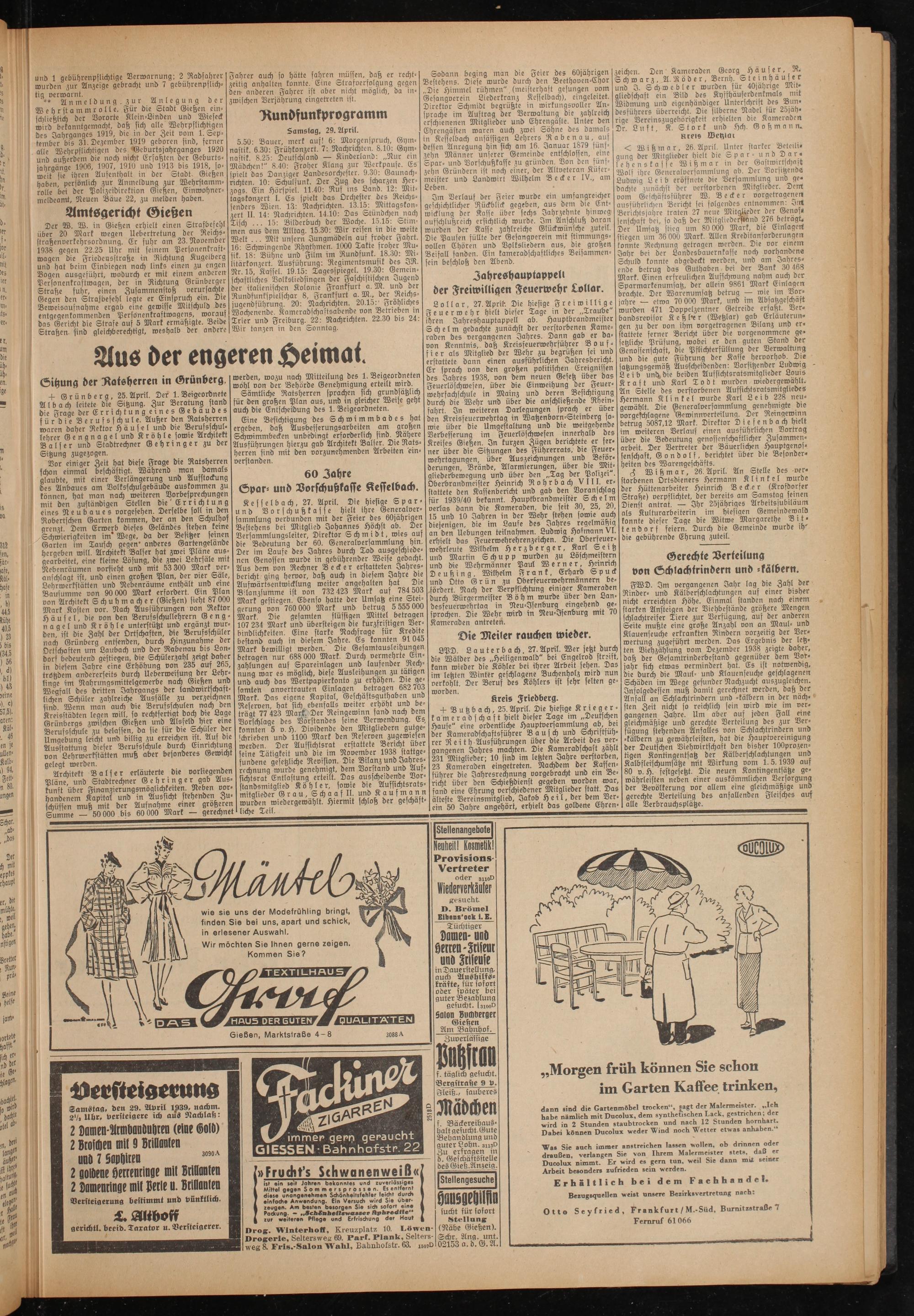 Verfteiseruns Samstag, den 29. Avril 1939, nachm. 2'/, Uhr, versteigere ich aus Nachlaß: 2 Damen-Htmöanüuören (eine SM 2 BroWn mit 9 Brillanten