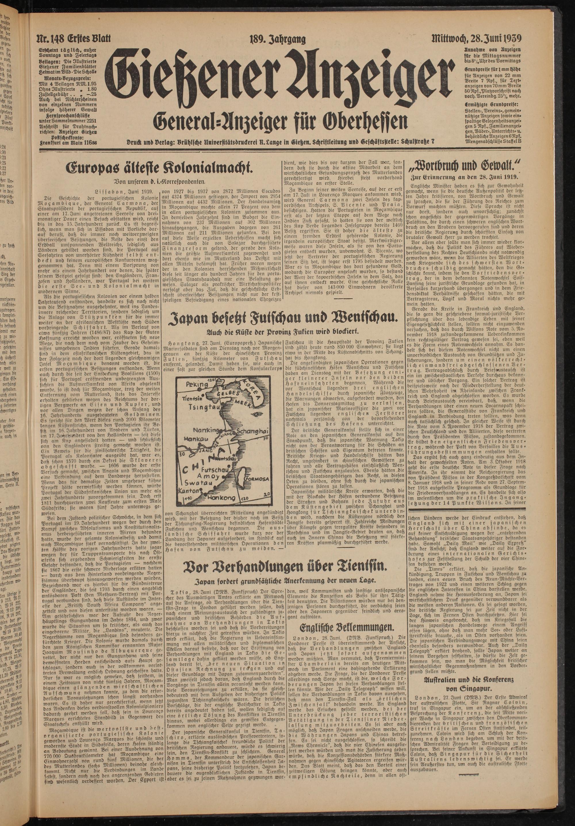 Erscheint täglich, außer Sonntags und Feiertags Beilagen: Die Illustrierte Gießener Familienblätter Heimat im Bild • Die Scholle
