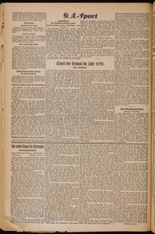 f e st mit über 700 aktiven Teilnehmern, das ausgezeichnet und in schönster Harmonie verlaufene Gaualterstreffen in Heuchelheim und das Hoherodskopf-Bergfest, das schon unter dem Schatten der oeginnenben kriegerischen Auseinandersetzungen stand. Eine erhebliche Bereicherung fand das sportliche Leben durch die Gliederungen der Partei. HI. und BDM. hielt Bann- und Unter- gaufporttage ob. SA. veranstaltete einen großangelegten Standartensporttag; stark war die Beteiligung an den Vorbereitungen für die Reichswettkämpfe der SA. Standarten- und Brigadestab traten in Fuß- und Handballkämpfen hervor. Die ff startete u. a. auch eine Gepäckmarschmeisterschaft. Die Politischen Leiter bestritten im Rahmen eines Appells verschiedene Hebungen. Das NSKK. brachte manche strapaziöse Gelände-, Drientierungs« und Nachtsuchfahrt hinter sich. Die Hitler-Jugend und der BDM. pflegten die Leibesübung in enger Anlehnung an den NSRL.