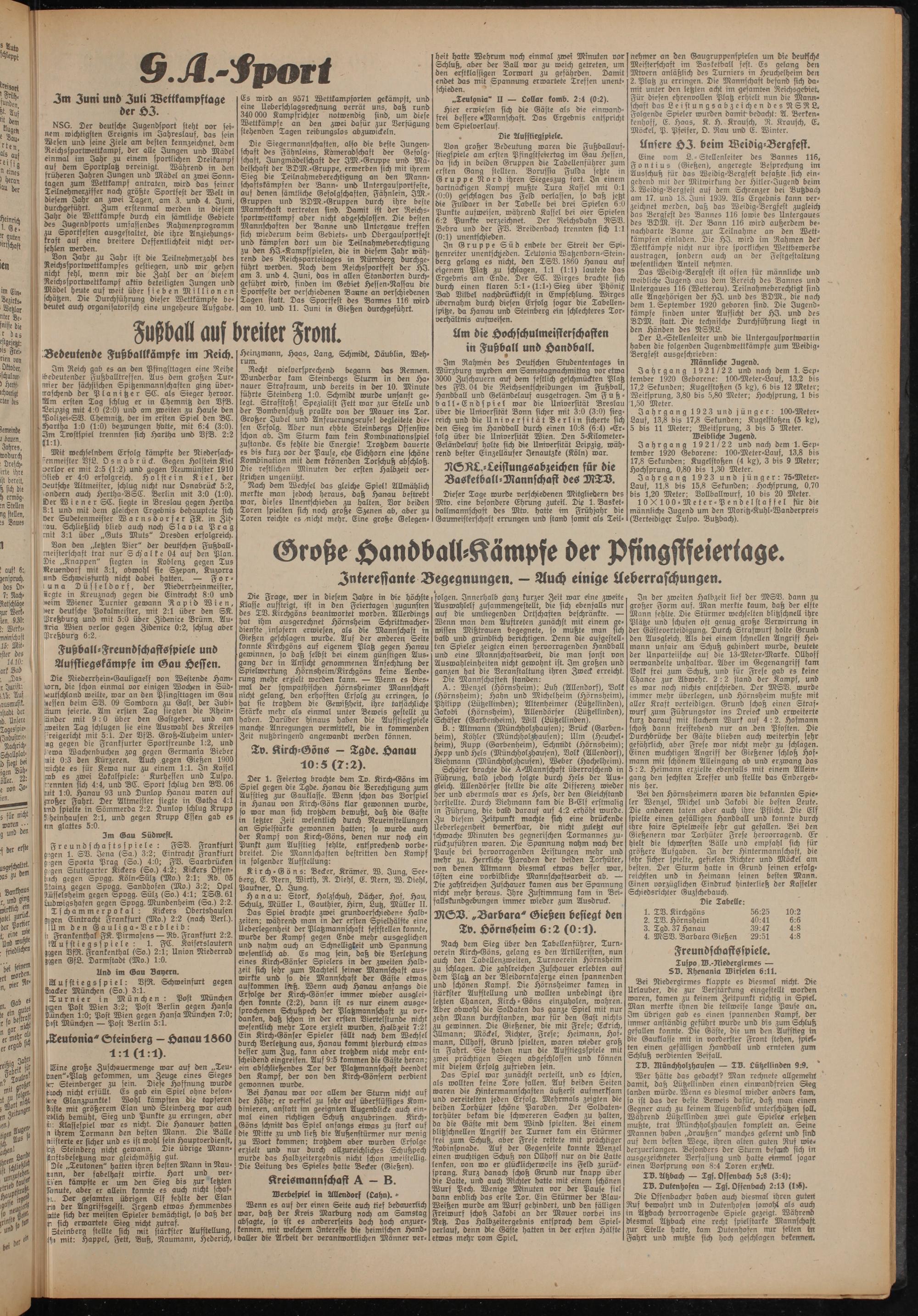 Don großer Bedeutung waren die Fußballauf- sttegspiele am ersten Pfingstfeiertag im Gau Hessen, da sich in beiden Gruppen die Tabellenführer zum ersten Gang stellten. Borussia Fulda setzte in Gruppe Nord ihren Siegeszug fort. In einem hartnäckigen Kampf mußte Tura Kassel mit 0:1 (0:0) geschlagen das Feld verlassen, so daß jetzt die Fuldaer in der Tabelle bei drei Spielen 6:0 Punkte aufweisen, während Kassel bei vier Spielen 6:2 Punkte verzeichnet. Der Reichsbahn RSV. Bebra und der FD. Breidenbach trennten sich 1:1 (0:1) unentschieden.