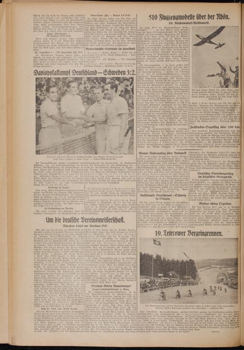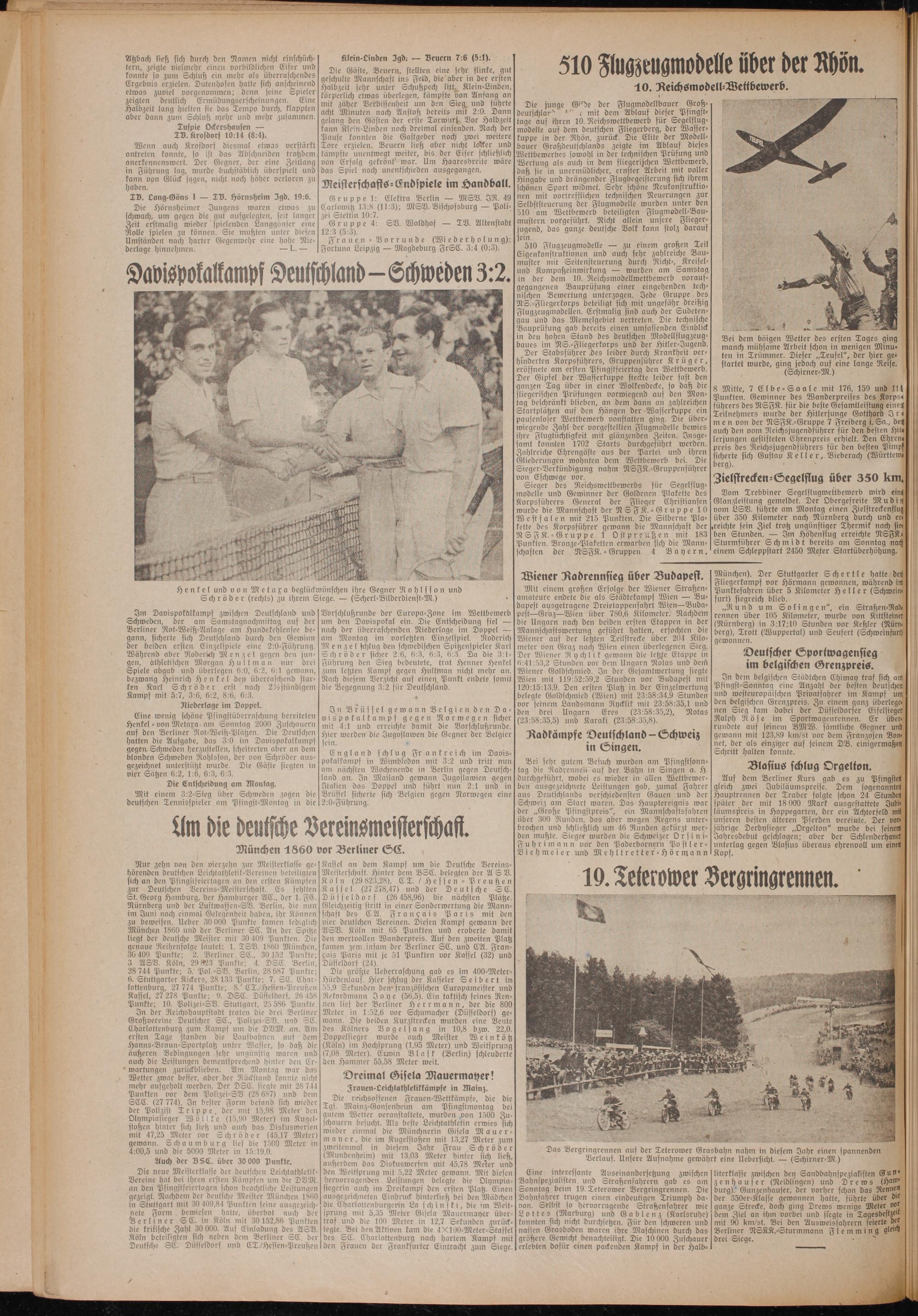 Eine wenig schöne Psingstüberraschung bereiteten Henkel - von Metaxa -am Sonntag 2000 Zuschauern auf den Berliner Rot-Weiß-Plätzen. Die Deutschen hatten die Aufgabe, das 3:0 im Davispokalkampf gegen Schweden herzuftellen, scheiterten aber an dem blonden Schweden Rohlsson, der von Schröder ausgezeichnet unterstützt wurde. Die Gäste siegten in vier Sätzen 6:2, 1:6, 6:3, 6:3.