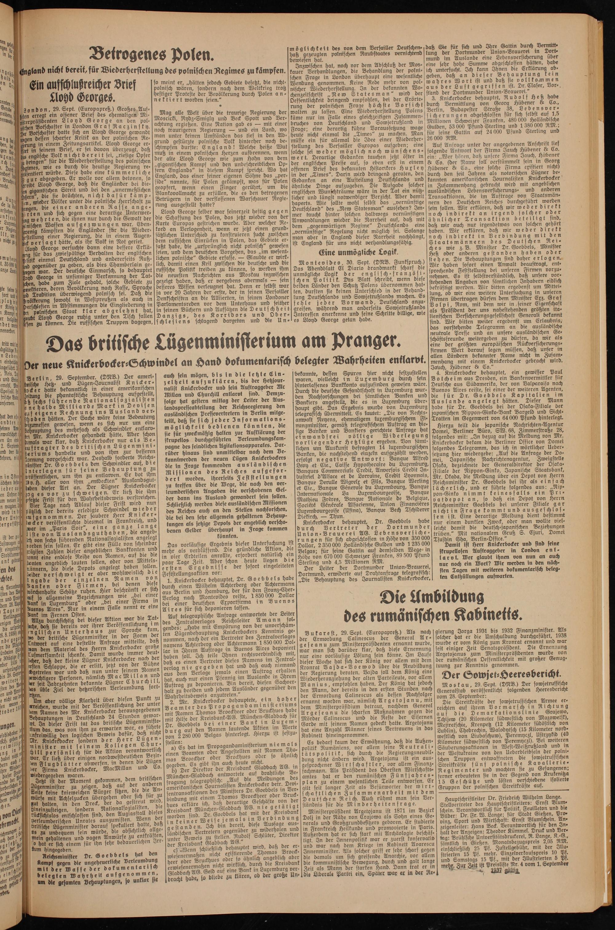 Knickerbocker behauptet, Dr. Goebbels habe durch Vertreter der Dortmunder Union-Brauerei AG. Lebensversicherungen für sich abgeschlossen in Höhe von 350 000 Dollar, 2 350 000 Holländische Gulden und 1235 000 Belgas; für seine Gattin auf demselben Wege in Höhe von 670 000 Schweizer Franken, 89 500 Pfund Sterling und 4,5 Millionen RM.