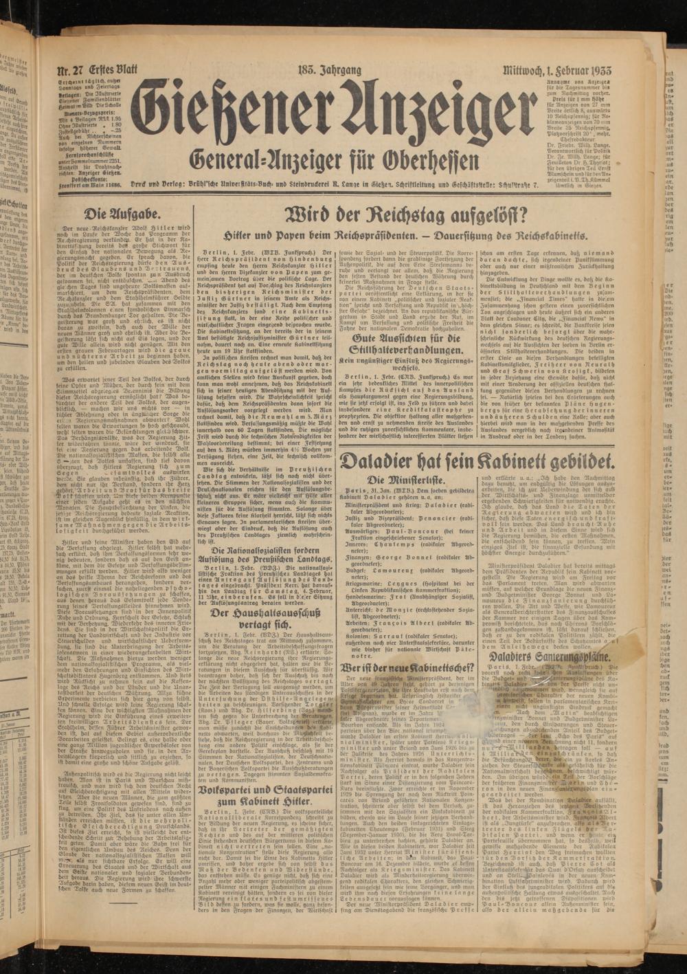 Volkspartei und Gtaatspartei zum Kabinett Hitler.