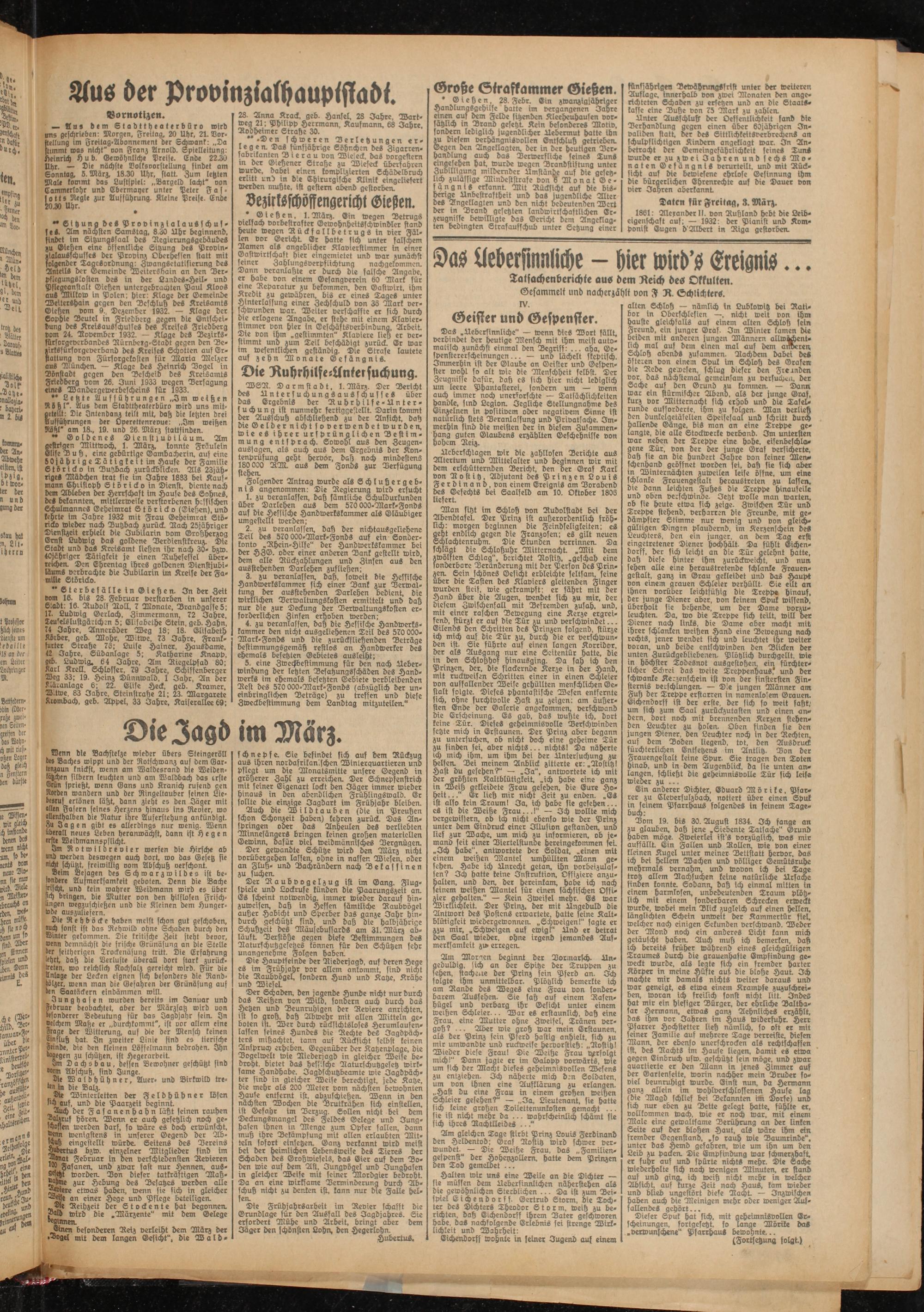 — Sitzung de S ProvinzialauSschuf- fei. 2lm nächsten Samstag, 8.30 Uhr beginnend, findet im Sitzungssaal des Regierungsgebäudes zu Gießen eine öffentliche Sitzung des Provin- rialauSschusseS der Provinz Oberhessen statt mit folgender Tagesordnung: Zwangsetatisierung des Anteils der Gemeinde WeiterSbain an den Der- pflegungslosten des in der Landes-Heil- und »mstalt Gießen untergebraqten Paul Kloos ilkow in Polen: hier: Klage der Gemeinde Weiter-Hain gegen den Beschluß des KreisamtS Gießen vom 9., Dezember 1932. — Klage der Sophie Beutel in Friedberg gegen die Gntschei- düng de- KreiSausschuises deS Kreises Friedberg vom 24. Rovember 1932. — Klage des Bezirks» fürsorgeverbandes Rürnberg-Stadt gegen den Be- »irksfursorgeverband des Kreises Schotten auf Erstattung von Fürsorgekosten für Maria Melzer aus München. — Klage des Heinrich Bogel in Bönstadt gegen den Bescheid des Kreisamts Friedberg vom 26. Juni 1933 wegen Dersagung eine» Wandergewerbescheins für 1933.