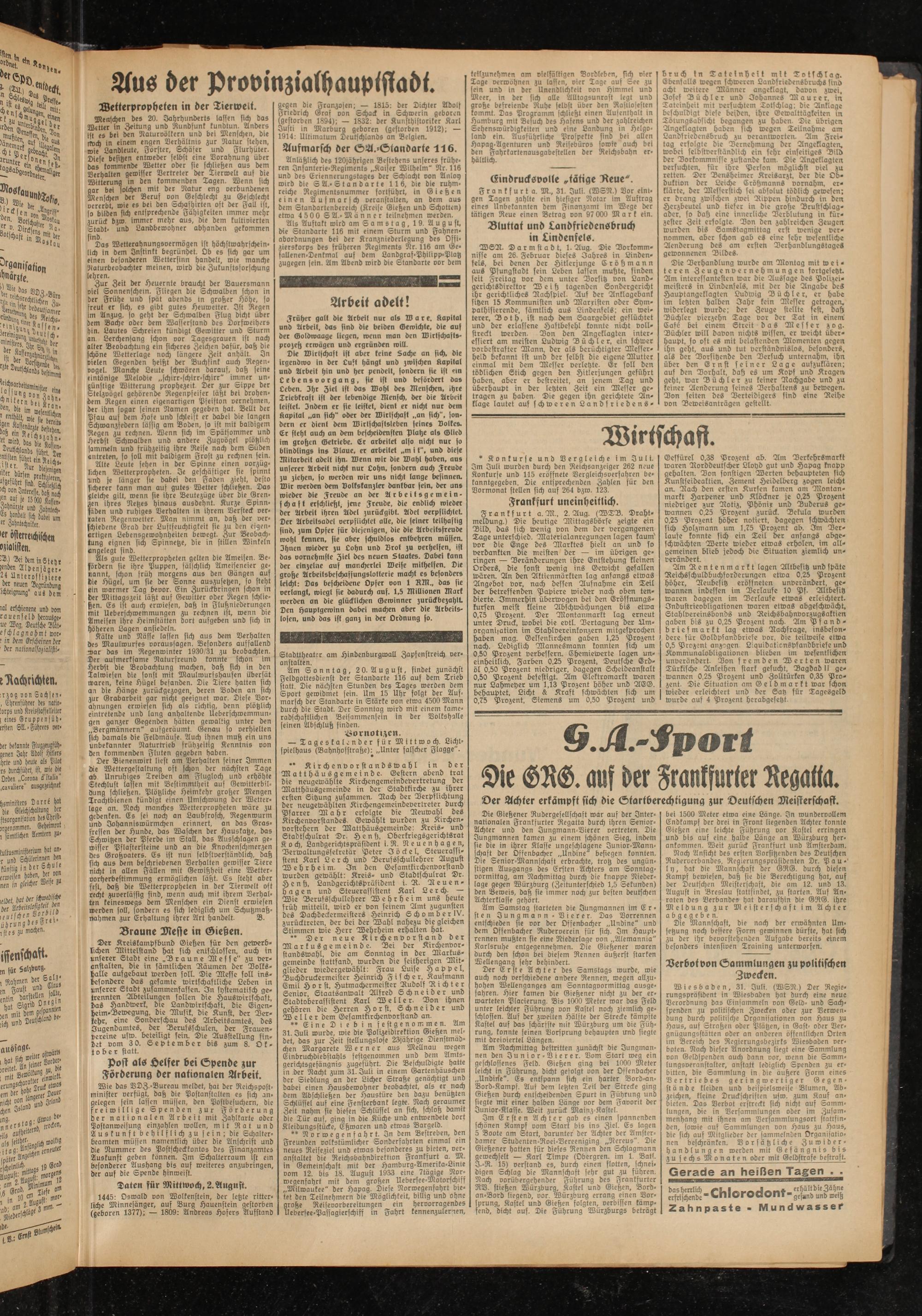 WSN. Darmstadt, l.Aug. Die Vorkommnisse am 26. Februar dieses Jahres in Lindenfels, bei denen der Hitlerjunge Crößmann aus Pfungstadt sein Leben lassen muhte, finden seit Freitag vor dem unter Vorsitz von Landgerichtsdirektor Weih tagenden Sondergericht ihr gerichtliches Nachspiel. Auf der Anklagebank sitzen 15 Kommunisten und Marxisten oder Sympathisierende, sämtlich aus Lindenfels: ein weiterer, D 01h, ist nach dem Saargebiet geflüchtet und der erlassene Haftbefehl konnte nicht vollstreckt werden. Don den Angeklagten interessiert am meisten Ludwig 2 ü ch l e r, ein schwer vorbestrafter Mann, der als berüchtigter Messerheld bekannt ist und der selbst die eigene Mutter einmal mit dem Messer verletzte. Er soll den tödlichen Stich gegen den Hitlerjungen geführt haben, aber er bestreitet, an jenem Tag und überhaupt in der letzten Zeit ein Messer getragen zu haben. Die gegen ihn gerichtete Anklage lautet auf schweren Landfriedens