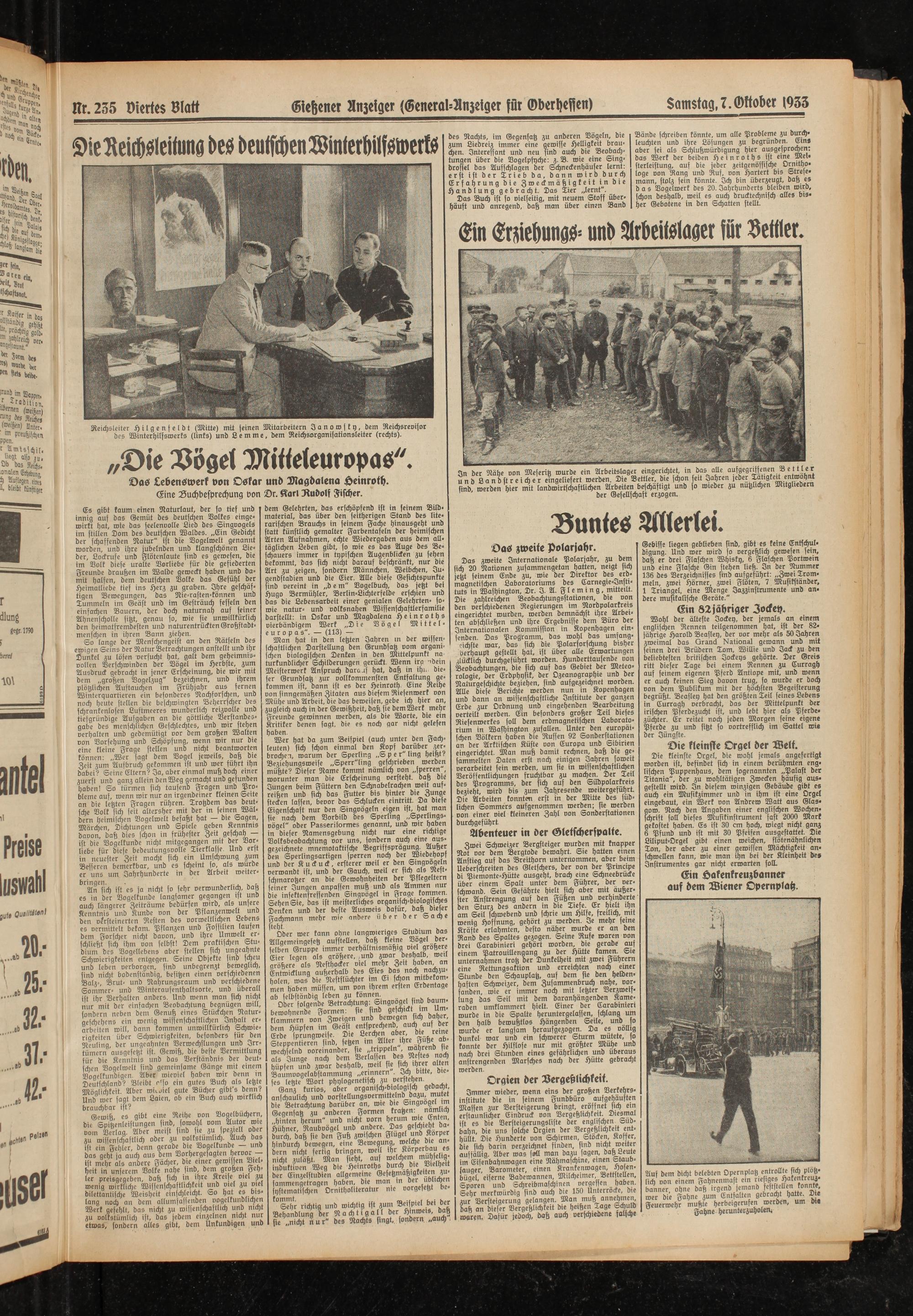 Reichsleiter H i l g e n f e l d t (Miste) mit feinen Mitarbeitern I a n o w f k y, dem Reichsrevisor des Winterhilfswerks (links) und ßetntne, dem Reichsorganisationsleiter (rechts). „Oie Vögel Mitteleuropas". Das Lebenswerk von Oskar und Magdalena Heinroth. Eine Buchbesprechung von Or. Karl Rudolf Fischer.