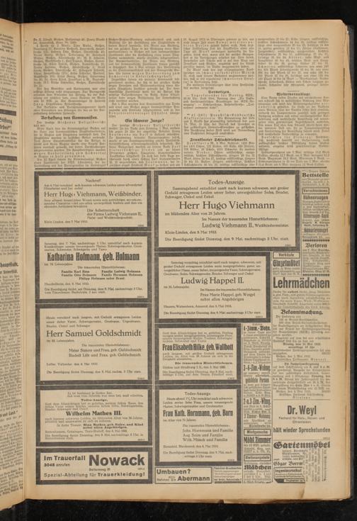 Die Beerdigung findet am Dienstag, dem 9. Mai, nachmittags 3 Uhr, vom Trauerhause Bachstraße 2 aus statt.