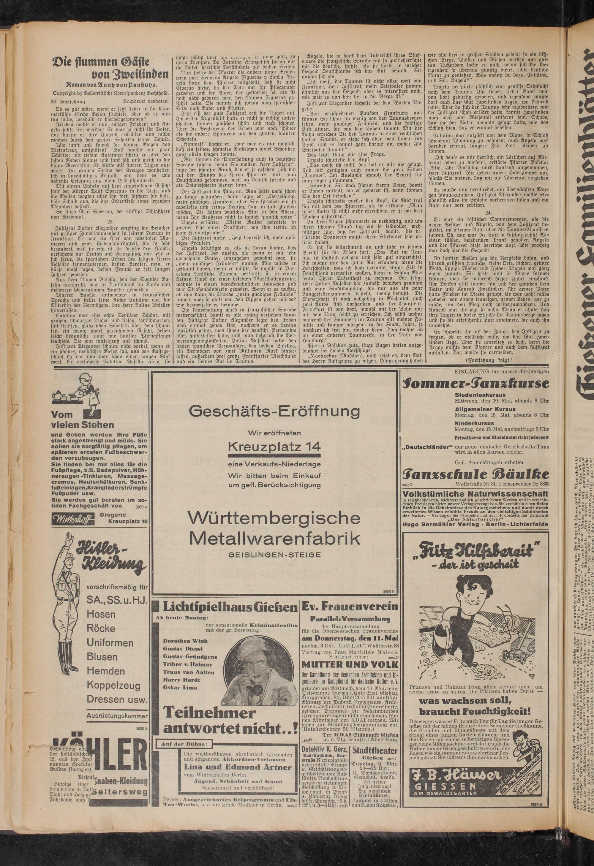 Der Kamplbund der deutschen Architekten und Ingenieure im Kamplbund für deutsche Kultur e. V. gründet am Mittwoch, dem 10. Mai, seine LrtSgruppe Gießen i.Cafö Ebel, Gießen, Burggraben, 87? Uhr (20 h 30) pünktlich. Männer der Technik, Ingenieure, Architekten, Techniker u. technisch Interessierte, arischen Stammes, die Geheimbünden (Freimaurerlogen) nicht angehönen, können Mitglieder des KDAI werden. Wir laden zur Gründungsversammlung ein. (Unkostenbeitrag 50 Pfennig.)