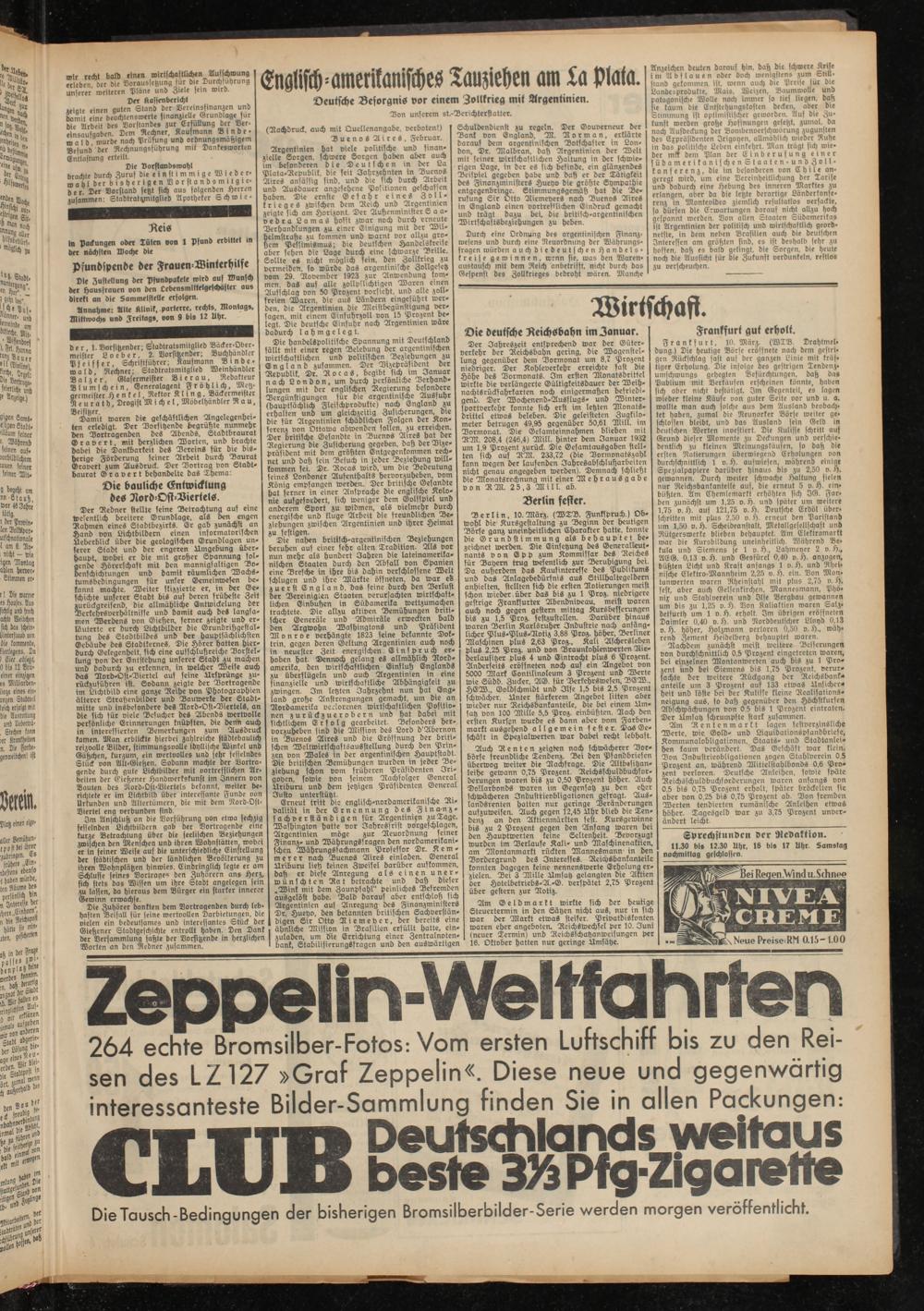 Argentinien hat viele politische und finanzielle Sorgen, schwere Sorgen haben aber auch im besonderen d i e Deutschen in der La Plata-Republik, die seit Jahrzehnten in Buenos Aires ansässig sind, und die sich durch Arbeit und Ausdauer angesehene Positionen geschaffen haben. Die ernste Gefahr eines Zollkrieges zwischen dem Reich und Argentinien zeigte sich am Horizont. Der Außenminister S a a- vedra Lamas hofft zwar noch durch erneute Verhandlungen zu einer Einigung mit der Wil- Helmstraße zu kommen und warnt vor allzu großem Pessimismus: die deutschen Handelskreise aber sehen die Lage durch eine schwarze Brille. Sollte es nicht möglich sein, den Zollkrieg zu vermeiden, so würde das argentinische Zollgesetz vom 29. November 1923 zur Anwendung kommen, das auf alle zollpflichtigen Waren einen Aufschlag von 50 Prozent vorsieht, und alle zollfreien Waren, die aus Ländern eingeführt werden, die Argentinien die Meistbegünstigung versagen, mit einem Einfuhrzoll von 15 Prozent belegt. Die deutsche Einfuhr nach Argentinien war«