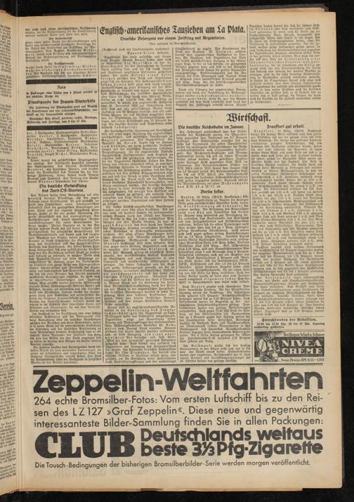Zeppelin-Weltfahrten 264 echte Bromsilber-Fotos: Vom ersten Luftschiff bis zu den Reisen des LZ 127 »Graf Zeppelin«. Diese neue und gegenwärtig interessanteste Bilder-Sammlung finden Sie in allen Packungen: vm Deutschlands weitaus ILUlf beste 3/3 Pfg-Zig a rette