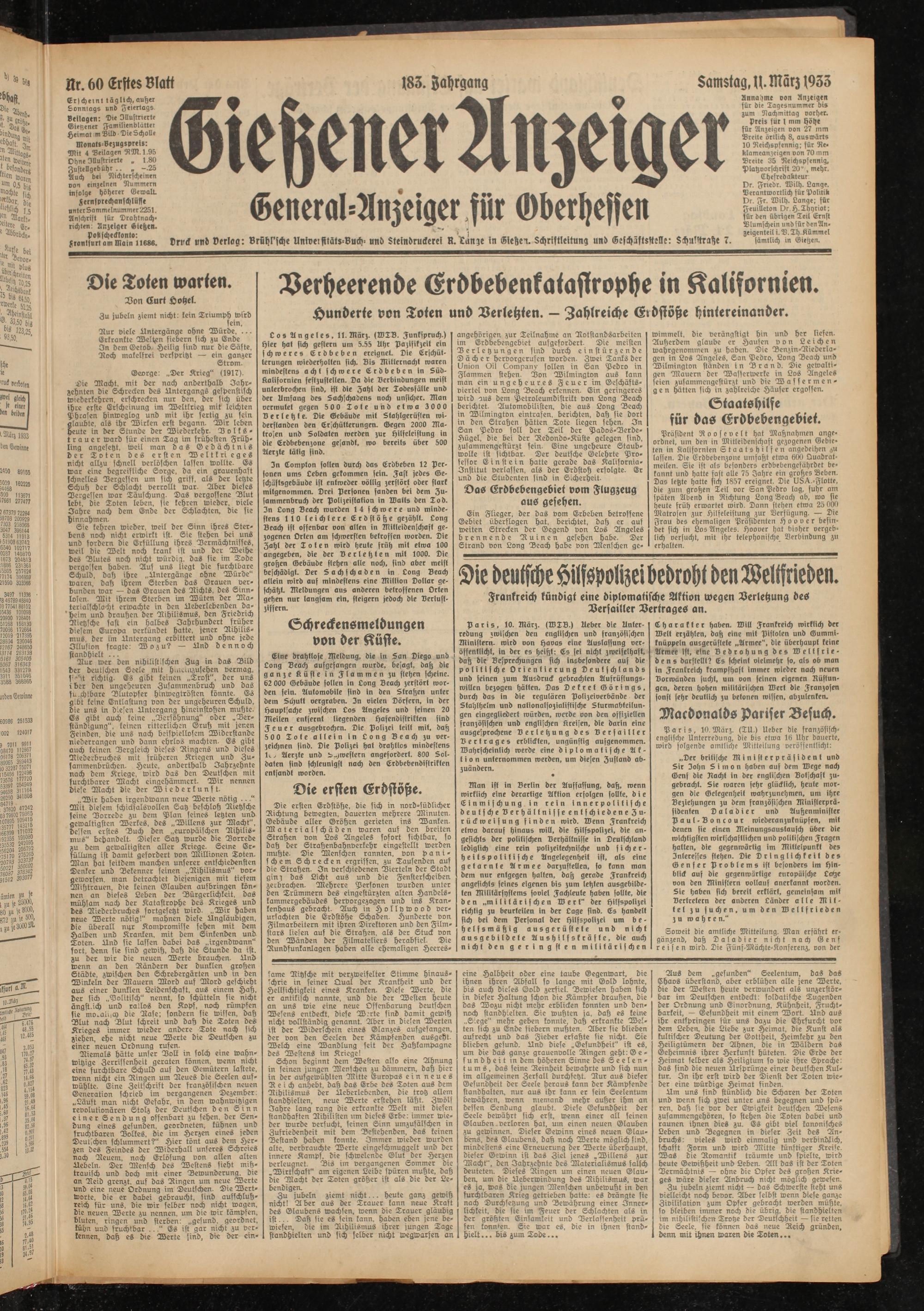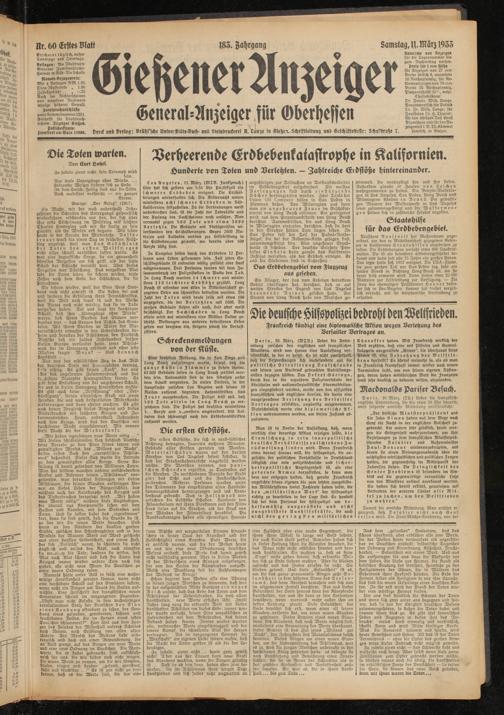 Los Angeles, 11. Mär;. (MTB. Funkspruch.) hier hat sich gestern um 5.55 Ahr Pazisikzeit ein chrveres Erdbeben ereignet. Die Erschütterungen wiederholten sich. Bis Mitternacht waren mindestens acht schwere Erdbeben in Süd- ftalifornien festzustellen. Da die Verbindungen meist unterbrochen sind, ist die Zahl der Todesfälle und der Umfang des Sachschadens noch unsicher. Man vermutet gegen 5 0 0 Tote und etwa 3000 verletzte. Die Gebäude mit Stahlgerüslen widerstanden den Erschütterungen. Gegen 2000 Matrosen und Soldaten werden zur Hilfeleistung in die Erdbebenzone gesandt, wo bereits über 500 Aerzte tätig sind.