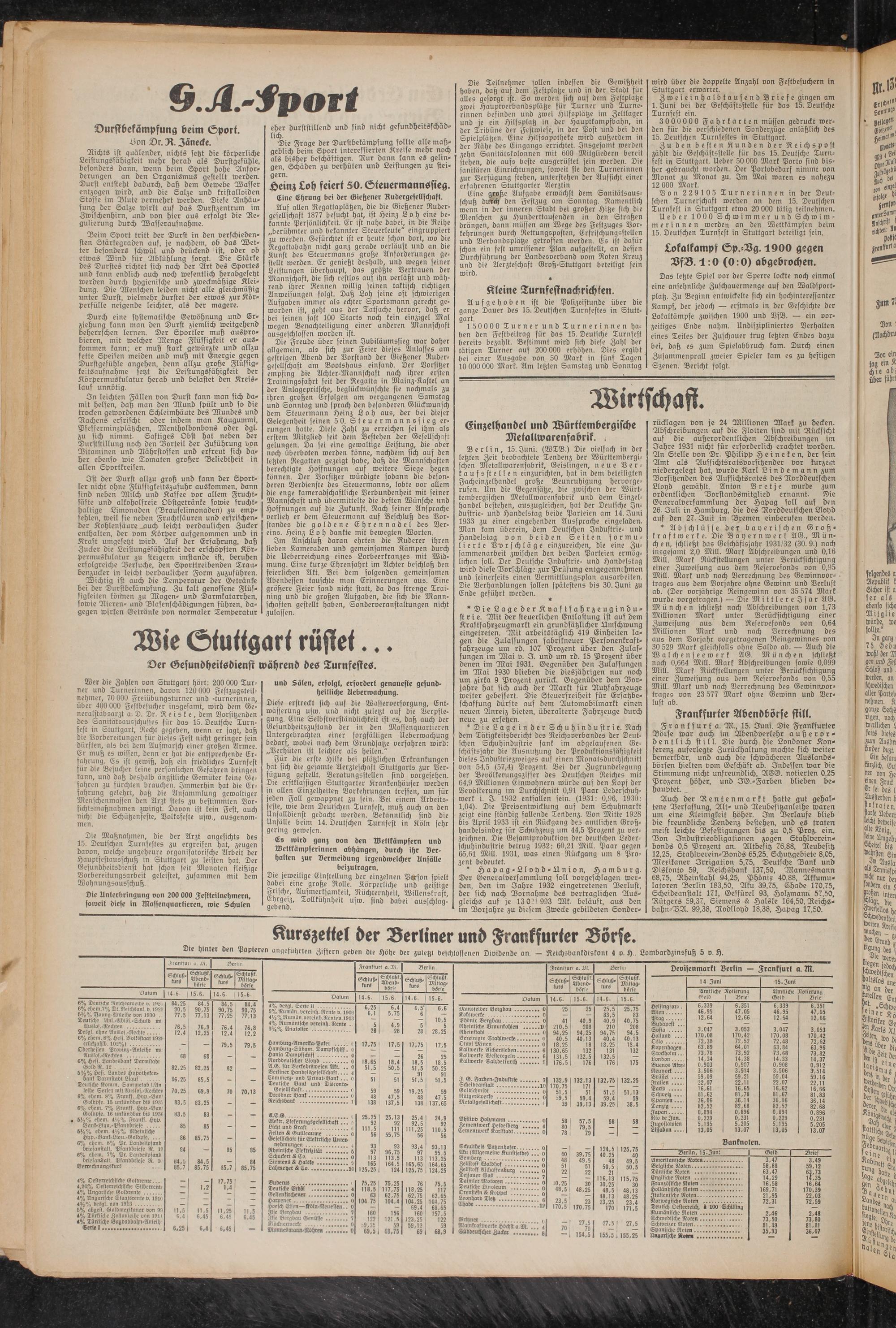 150000 Turner und Turnerinnen haben den Festbeitrag für das 15. Deutsche Turnfest bereits bezahlt. Bestimmt wird sich diese Zahl der tätigen Turner auf 200 000 erhöhen. Dies ergibt bei einer Ausgabe von 50 Mark in fünf Tagen 10 000 000 Mark. Am letzten Samstag und Sonntag