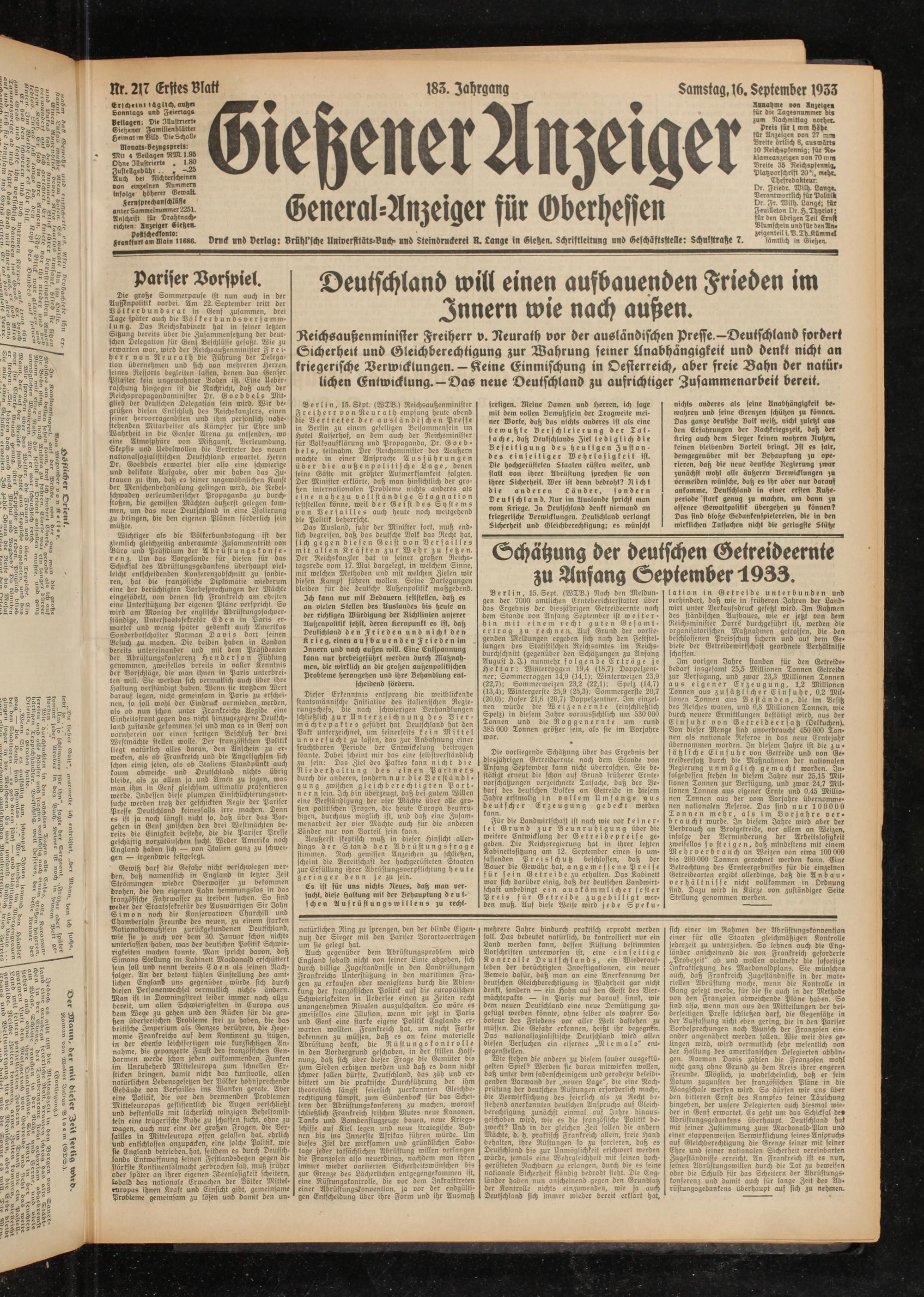 Berlin, 15. Sdpt. (WTB.) Reichsaußenminister Freiherr von Neurath empfang heute abend die Vertreter der ausländischen Presse in Berlin zu einem geselligen Beisammensein im Hotel Kaiserhof, an dem auch der Reichsminister für Volksaufklärung und Propaganda, Dr. Goebbels, teilnahm. Der Reichsminister des Aeußern machte in einer Ansprache Ausführungen über d i e außenpolitische Lage, denen seine Gäste mit größter Aufmerksamkeit folgten. Der Minister erklärte, daß man hinsichtlich der großen internationalen Probleme nichts anderes als eine nahezu vollständige Stagnation feststellen könne, weil der Gei st des Systems von Versailles auch heute noch weitgehend die Politik beherrscht.