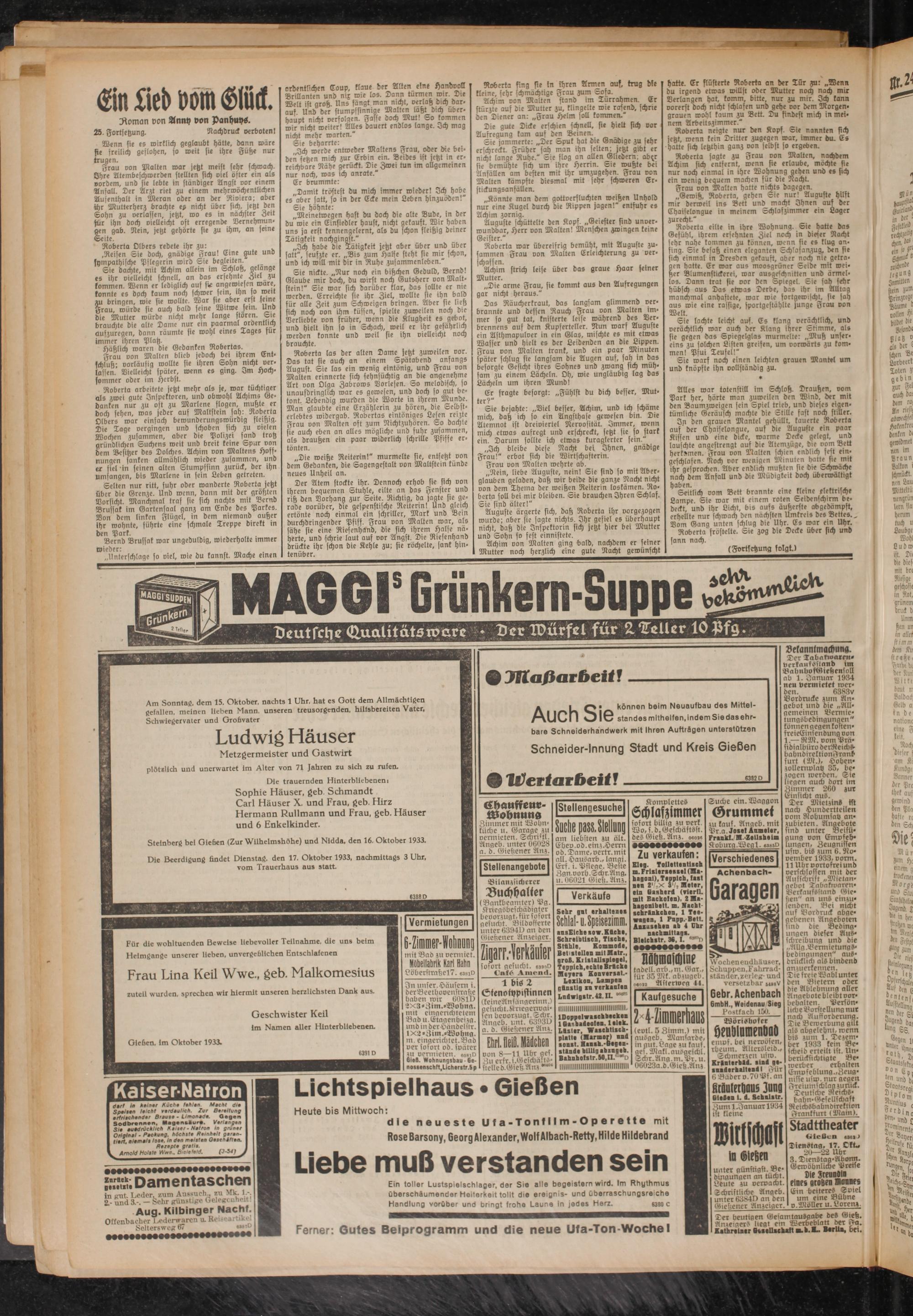 Die Beerdigung findet Dienstag, den 17. Oktober 1933, nachmittags 3 Uhr, vom Trauerhaus aus statt