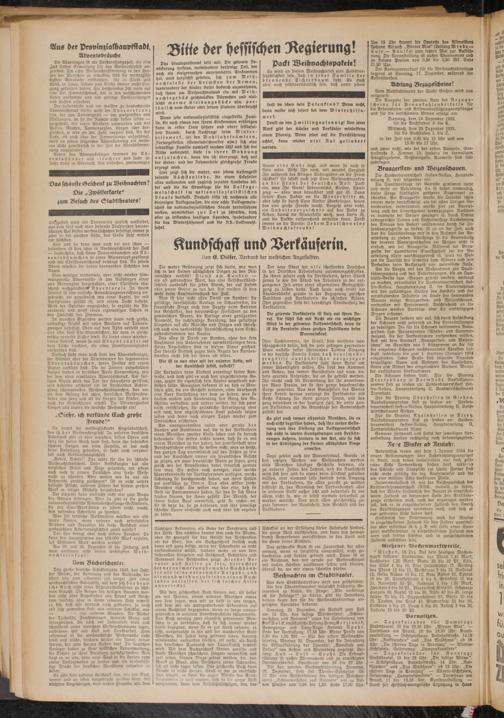 Das Staabpreifeamt Wit mit. Dl« gesamt« Bevölkerung Hessens, insbesondere derjenige Teil, der noch ein eiaigermaßen annehmbares Einkommen hat, wird herzlichst gebeten, sich zum weih- aachlsfeste der Aermsten der Armen, insbesondere der filaber dieser dadurch auzunehmen, daß ihnen am Weihnachtsabend ein mit weih- nachtsgebäck geschmücktes Bäumchen und vielleicht warme Kleidungsstücke nfw. persönlich vom Geber oder seinen Kindern überbracht wird.