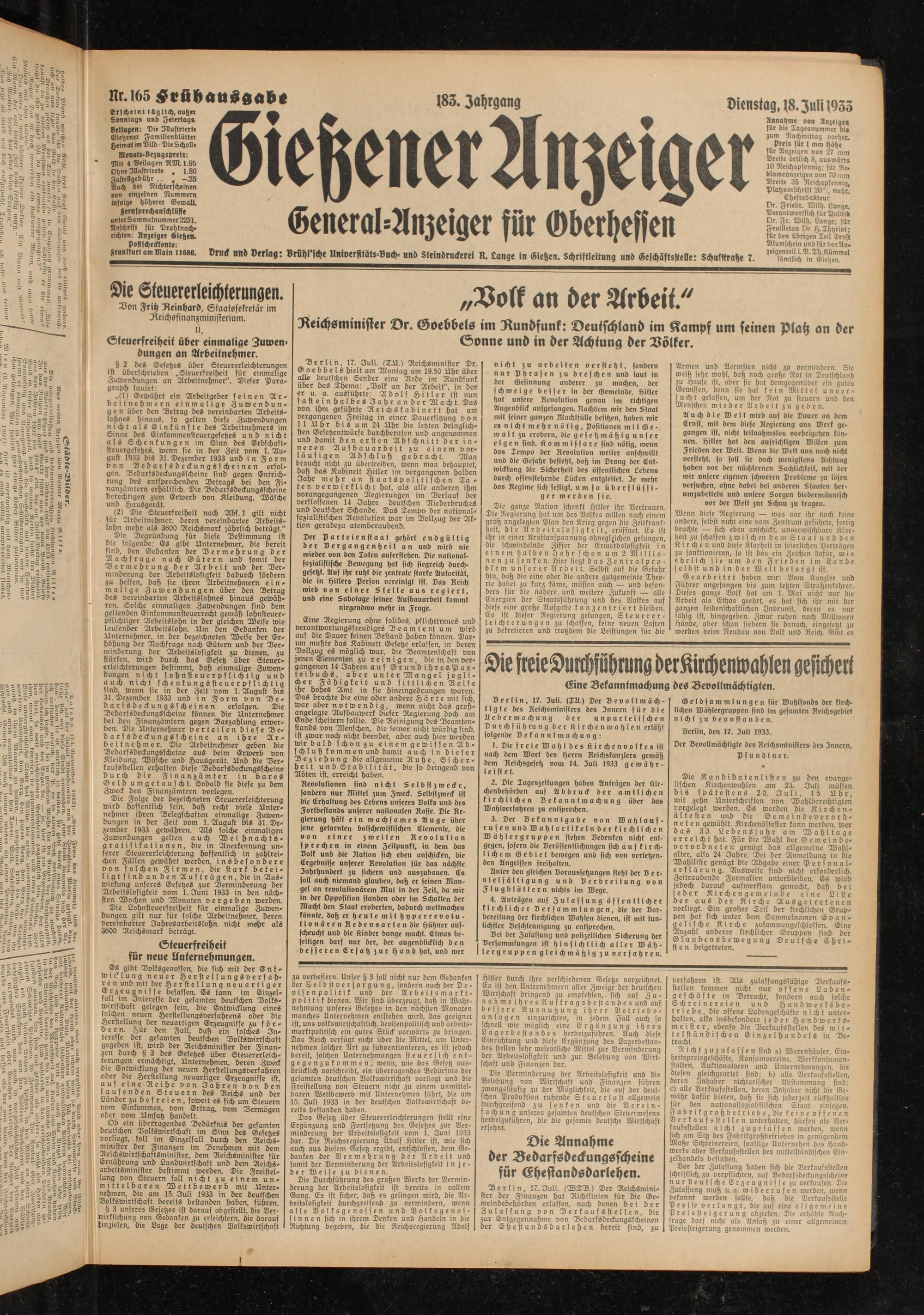 Berlin, 17. Juli. (SU.) Reichsminister Dr. Goebbels hielt am Montag um 19.50 Uhr über alle deutschen Sender eine Rede im Rundfunk über das Thema: „Volk an der Arbeit", in der er u. a. ausführte: Adolf Hitler ist nun fasteinhalbesIahr anderMacht. Das von ihm geführte Reichskabinett hat am vergangenen Freitag in einer Dauersitzung von 1 1 U & r bis urn 24 Uhr die letzten dringlichsten Gesetzentwürfe durchberaten und angenommen und damit den er st en Abschnitts er inneren Aufbauarbeit zu einem vorläufigen Abschluß gebracht. Man braucht nicht zu übertreiben, wenn man behauptet, daß das Kabinett Hitler im vergangenen halben 3ahr mehr an staatspolitischen Ta - ten verwirklicht hat, als alle anderen ihm vorangegangenen Regierungen im Verlauf der verflossenen 14 Jahre deutschen Riederbruches und deutscher Schande. Das Tempo der nationalsozialistischen Revolution war im Vollzug der Aktion geradezu atemberaubend.