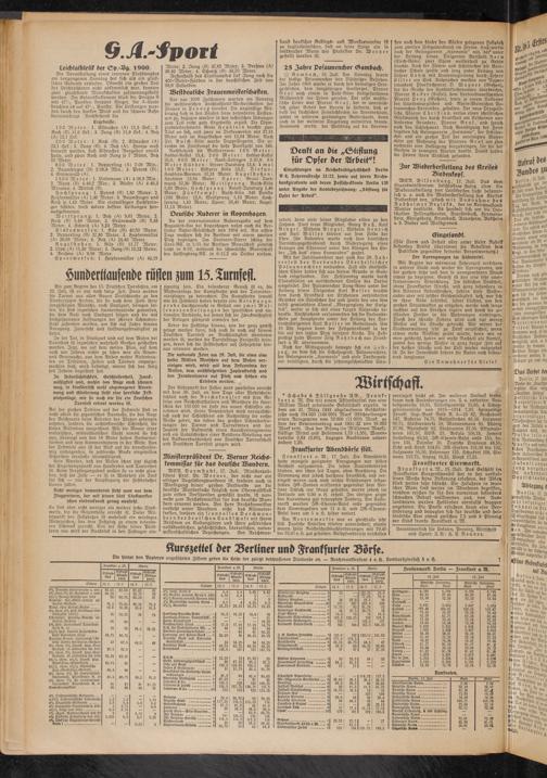 zigartig fein. Ein besonderer Genuß ist es, die Musteranlage der Kampfbahn und des Tennisturnierplatzes zu betrachten. Die Kampfbahn sowohl wie die Festwiese haben bereits eine Belastungsprobe durchgemacht in Gestalt von zwei Mas - senoeranstaltungen der sportlichen und nationalen Verbände, bei denen sich die Zweckmäßigkeit der Anlagen glänzend erwiesen hat.