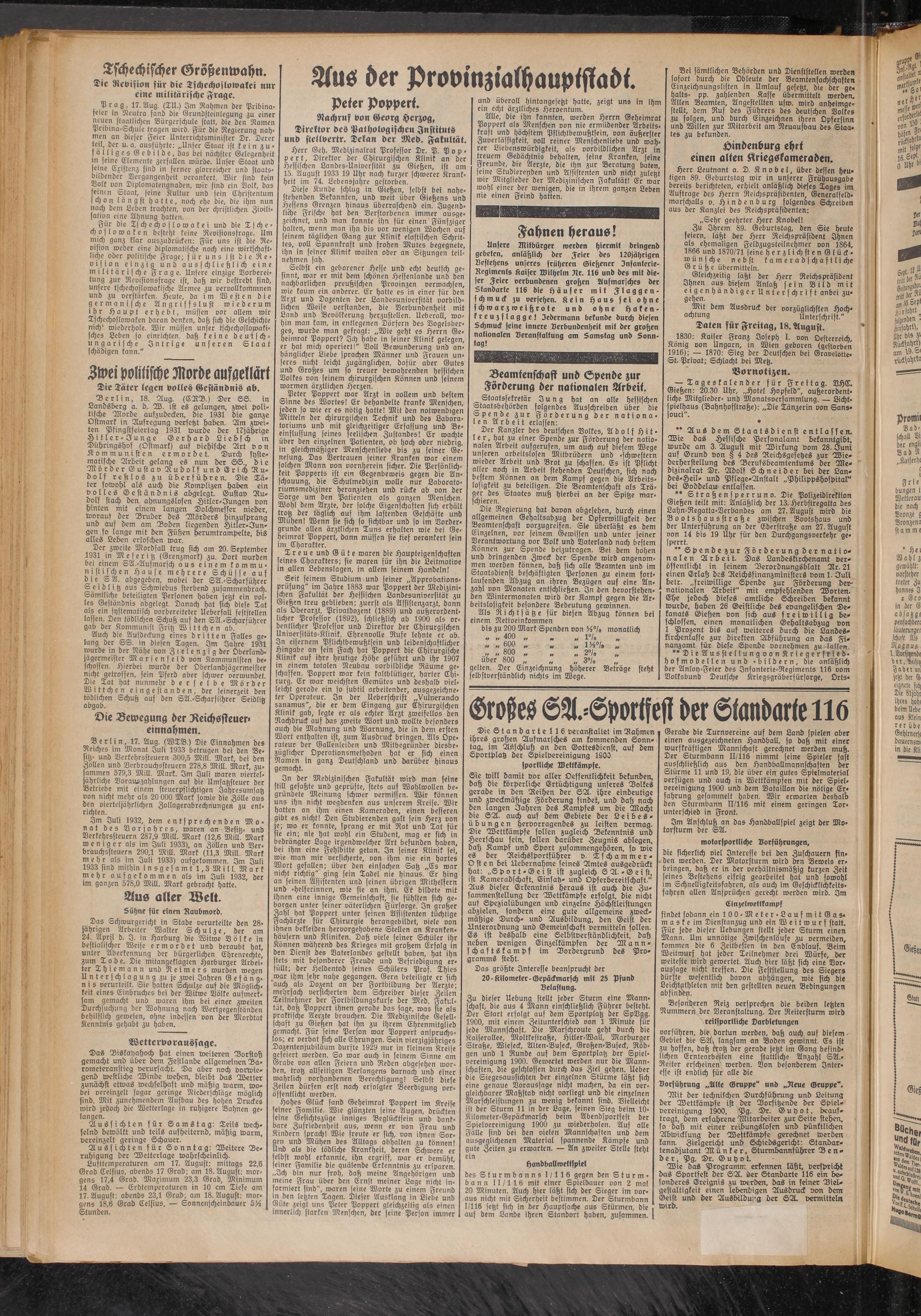 Berlin. 18. Aug. (ERB.) Der ES. in Landsberg a. d. W. ist es gelungen, zwei politische Morde aufzudecken, die 1931 die ganze Ostmark in Aufregung versetzt haben. Am zweiten Psingstseiertag 1931 wurde der 17jährige Hitler-Junge Gerhard Liebsch in Dühringshos (Ostmark) aus viehische Art von Kommuni st en ermordet. Durch systematische Arbeit gelang es nun der SS. d i e Mörder Gustav Rudolf und Erich Rudolf restlos zu überführen. Die Täter sowohl als auch die Komplizen haben ein volles Geständnis abgelegt. Gustav Rudolf stach den ahnungslosen Hitler-Jungen von hinten mit einem langen Dolchmesser nieder, worauf der Bruder des Mörders hinzusprang und auf dem am Boden liegenden Hitler-Zungen so lange mit den Füßen herumtrampelte, bis alles Leben erloschen war.