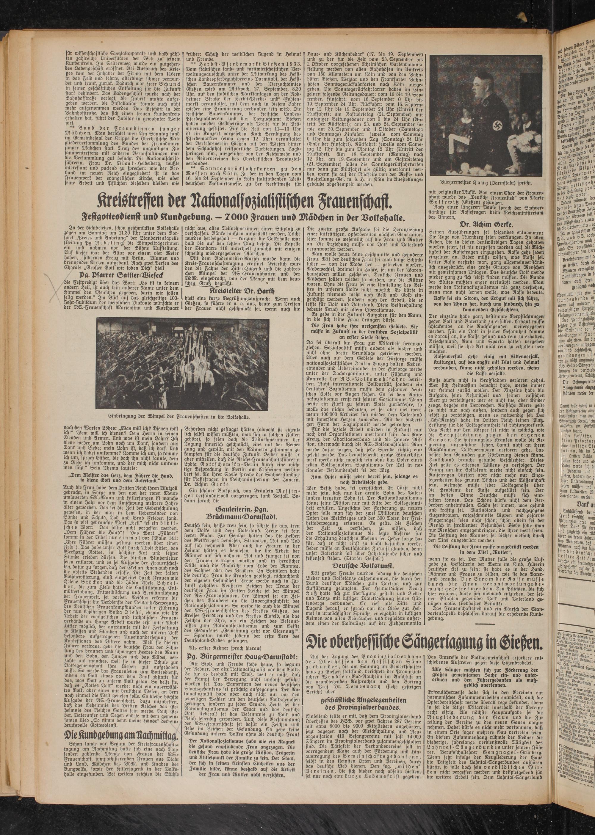 Behörden nicht geflaggt hätten (obwohl sie eigentlich selbst wissen müßten, was sich in solchen Fallen gehöre), so seien doch die Teilnehmerinnen der Tagung innerlich geschmückt, eins mit der Bewegung und gewillt, mit den Männern zusammen zu kämpfen für die deutsche Zukunft. Leider müsse er aber mitteilen, daß die Reichs-Frauenschaftsführerin Lydia G o ttsch e w s ky - Berlin durch eine wichtige Besprechung in Berlin am Erscheinen verhindert sei. An ihrer Stelle spreche der Sachverständige für Rassefragen im Reicysministerium des Innern, Dr. Achim G e r f e.