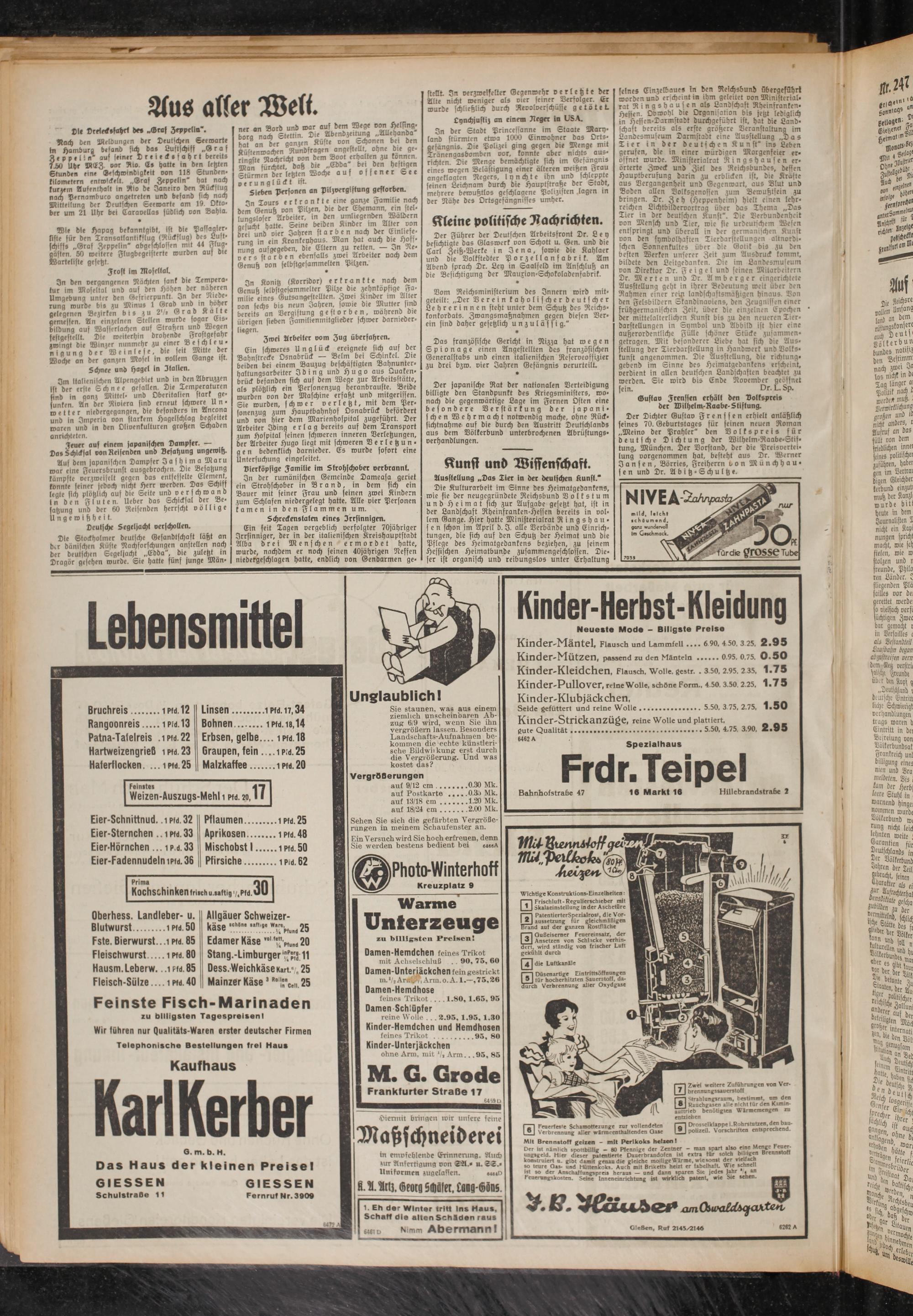 In Könitz (Korridor) erkrankte nach dem Genuß selbstgesammelter Pilze die zehnkbpfige Fa- milie eines Gutsangestellten. Zwei Kinder im Alter von sechs bis neun Jahren, sowie die Mutter sind bereits an Vergiftung gestorben, während die übrigen sieben Familienmitglieder schwer darnieder- liegen.
