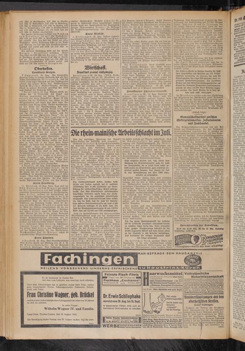 Hühneraug.-Lebewohl Blechd. (8 Pflast.) 68 Pf. in Apoth. u. Drog. Sicher zu haben: Uled.-Drog. Haus Hindenburg, H. Elges, Seltersweg 68a; Löwen-Drog. W. Kilbinger NH., Seltersweg 69; H. Noll, Lndwigsplatz-n.Neustadt-Drog.; Germania-Drog. C. Seibel, Frkf. Str. 39; 0. Winterhoft, Drog., Kreuzpl. 9/10.