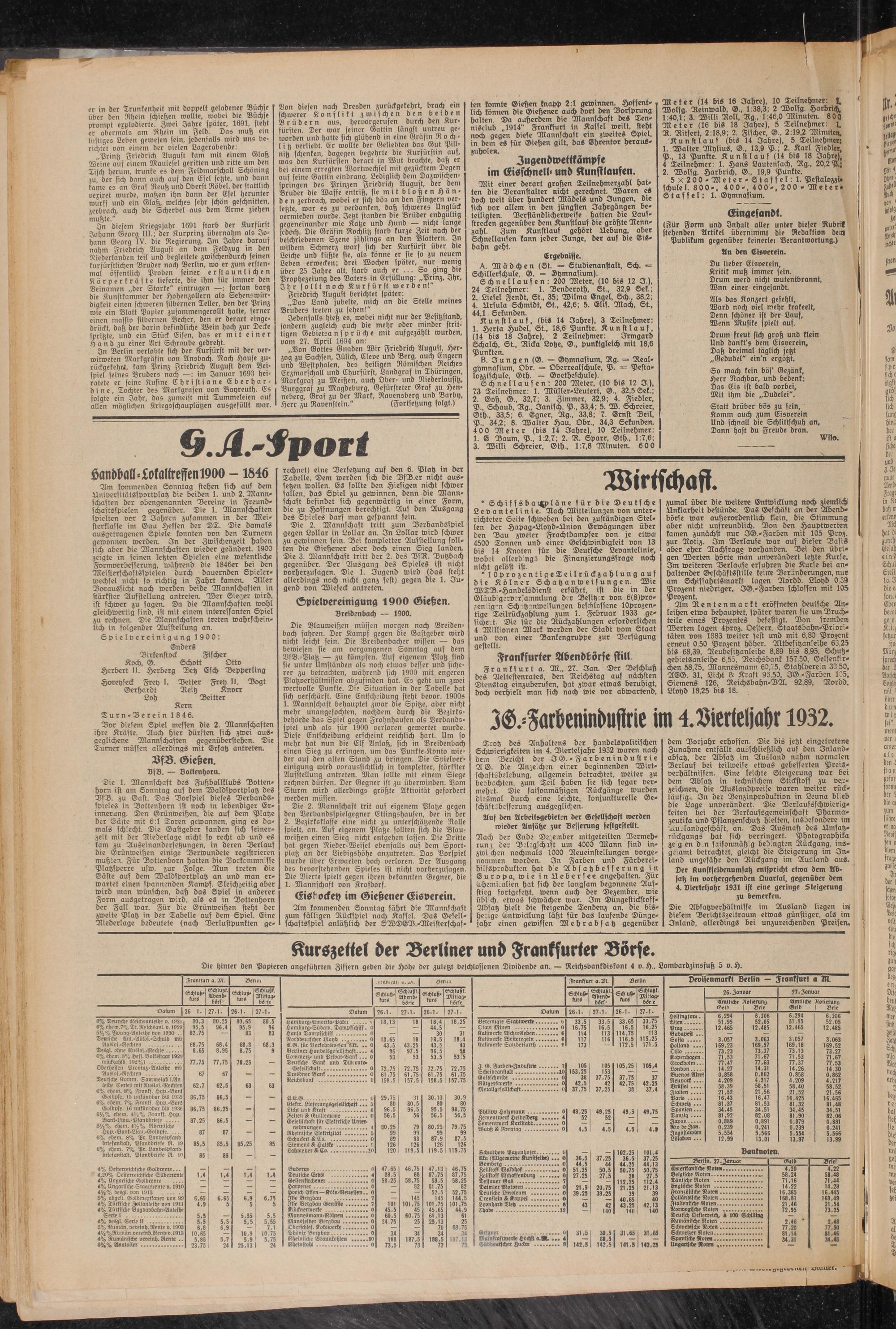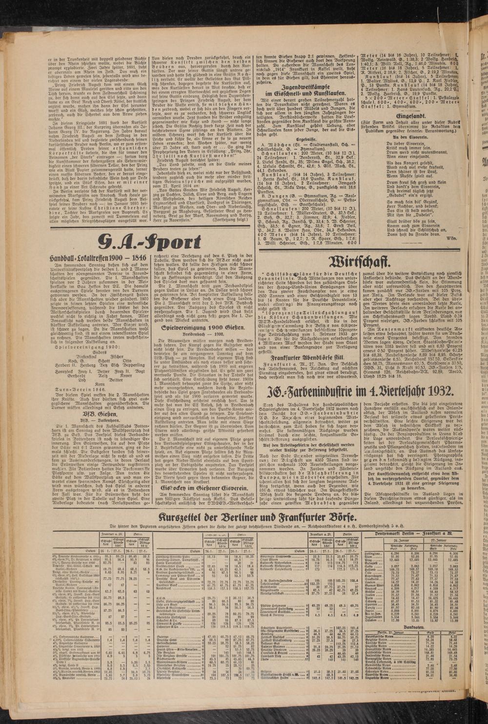 Am kommenden Sonntag stehen sich auf dem älniversitätssportplatz die beiden 1. und 2. Mannschaften der obengenannten Vereine in Freundschaftsspielen gegenüber. Die 1. Mannschaften spielten vor 2 Zähren zusammen in der Meisterklasse im Gau Hessen der DT. Die damals ausgctragenen Spiele konnten von den Turnern gewonnen werden. In der Zwischenzeit haben sich aber die Mannschaften wieder geändert. 1903 zeigte in seinen letzten Spielen eine wesentliche Formverbesserung, während die 1846er bei den Meisterschaftsspielen durch dauernden Spielerwechsel nicht so richtig in Fahrt kamen. Aller Voraussicht nach werden beide Mannschaften in stärkster Aufstellung antreten. Wer Sieger wird, ist schwer zu sagen. Da die Mannschaften wohl gleichwertig sind, ist mit einem interessanten Spiel zu rechnen. Die Mannschaften treten wahrscheinlich in folgender Ausstellung an.