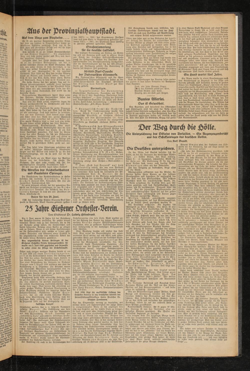 Die beiden deutschen Minister waren am Abend des 27. gekommen — Hermann Müller hielt sich vollständig zurückgezogen auf seinem Zimmer, um der zudringlichen Neugier keine Gelegenheit zu geben — und fuhren ein paar Stunden nach vollzogener Unterschrift am Aoend des 28. um neun Uhr von Versailles wieder ab. Mit ihnen reifte der größere Teil der noch in Versailles befindlichen Delegation, auch die gesamte Pressegruppe.