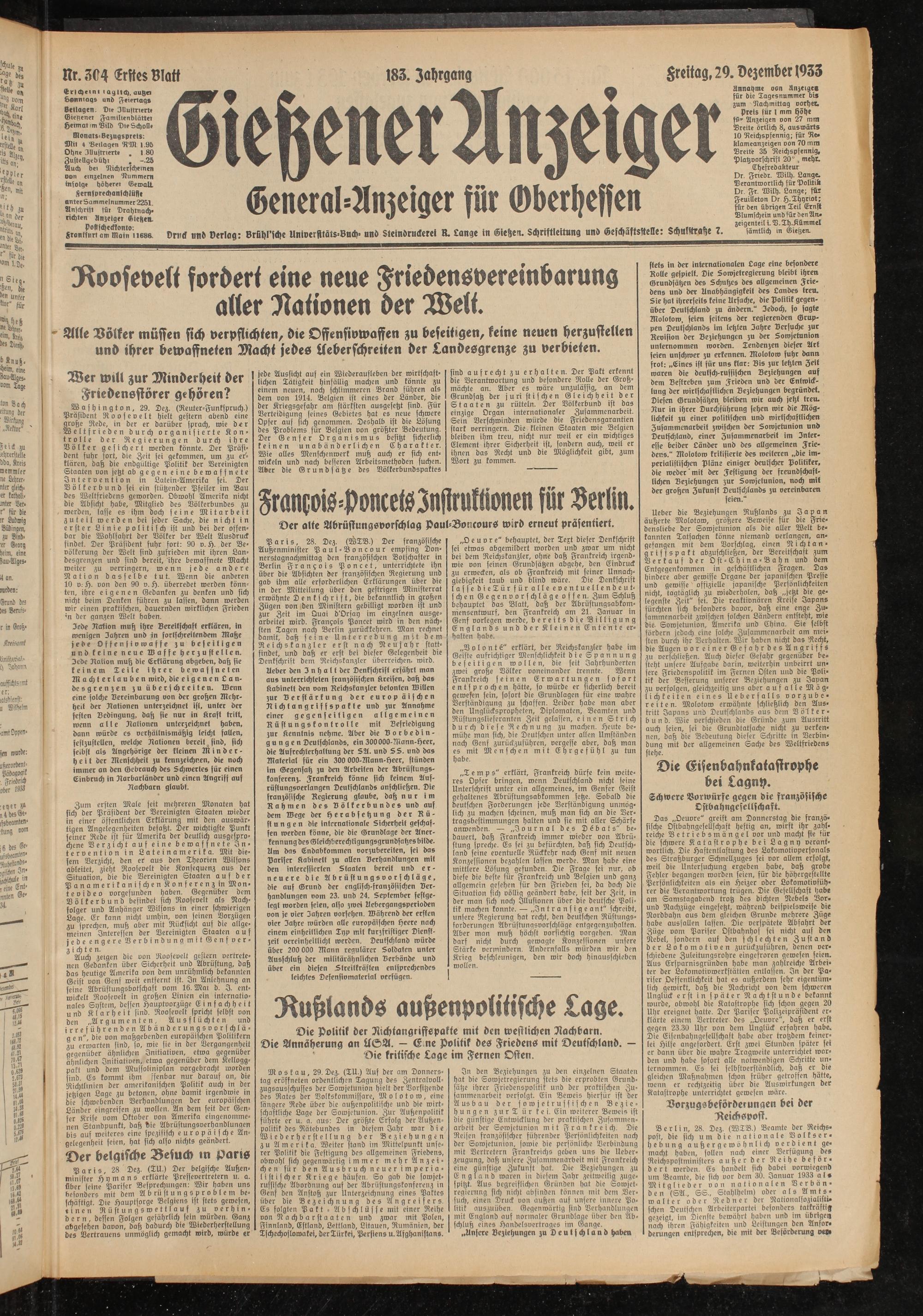 Washington, 29. Dez. (Reuter-Funkspruch.) Präsident Roosevelt hielt gestern abend eine große Rede, in der er darüber sprach, wie der Weltfrieden durch organisierte Kontrolle der Regierungen durch ihre Völker gesichert werden könnte. Der Präsident fuhr fort, die Zeit sei gekommen, um zu erklären, daß die endgültige Politik der Vereinigten Staaten oon jetzt ab gegen eine bewaffnete Intervention in Latein-Amerika sei. Der Völkerbund sei ein stützender Pfeiler im Bau des Weltfriedens geworden. Obwohl Amerika nicht die Absicht habe, Mitglied des Völkerbundes zu werden, lasse es ihm doch seine Mitarbeit zuteil werden bei jeder Sache, die nicht in er st er Linie politisch ist und bei der offenbar die Wohlfahrt der Völker der Welt Ausdruck findet. Der Präsident fuhr fort: 90 v. S). der Bevölkerung der Welt sind zufrieden mit ihren Landesgrenzen und sind bereit, ihre bewaffnete Macht weiter zu verringern, wenn jede andere Nation dasselbe tut. Wenn die anderen 10 v. S). von den 90 v. H. überredet werden könnten, ihre eigenen Gedanken zu denken und sich nicht beim Denken führen zu lassen, dann werden wir einen praktischen, dauernden wirklichen Frieden 'n der ganzen Welt haben.