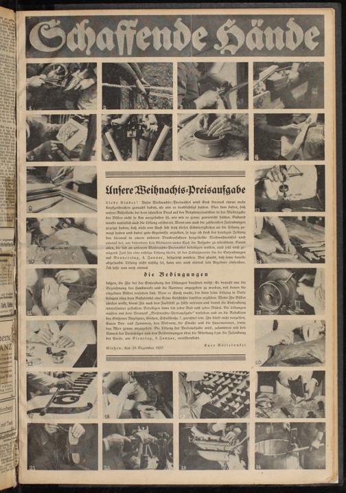 folgen, die Ihr bei der Einsendung der Lösungen beachten müht: Es braucht nur die Bezeichnung des Handwerks und die Nummer angegeben zu werden, mit denen die einzelnen Bilder versehen sind. Wem es Späh macht, der kann seine Lösung in Verse bringen oder dem Nätselonkel eine kleine Geschichte darüber erzählen. Wenn Ihr Bilder schicken wollt, könnt Ihr auch den Farbstift zu Hilfe nehmen und damit die Einsendung interessanter gestalten. Beteiligen kann sich jeder Bub und jedes Mädel. Die Lösungen müssen mit dem Vermerk „Weihnachts-Preisaufgabe" versehen und an die Redaktion des Giehener Anzeigers, Giehen, Schulstrahe 7, gerichtet sein. Ihr dürst nicht vergessen, Euren Vor- und Zunamen, den Wohnort, die Strahe und die Hausnummer, sowie das Alter genau anzugeben. Die Lösung der Preisausgabe wird, zusammen mit den Namen der Preisträger und den Bestimmungen über die Abholung bzw.die Zusendung der Preise, am Dienstag, 9. Januar, verössentlicht.