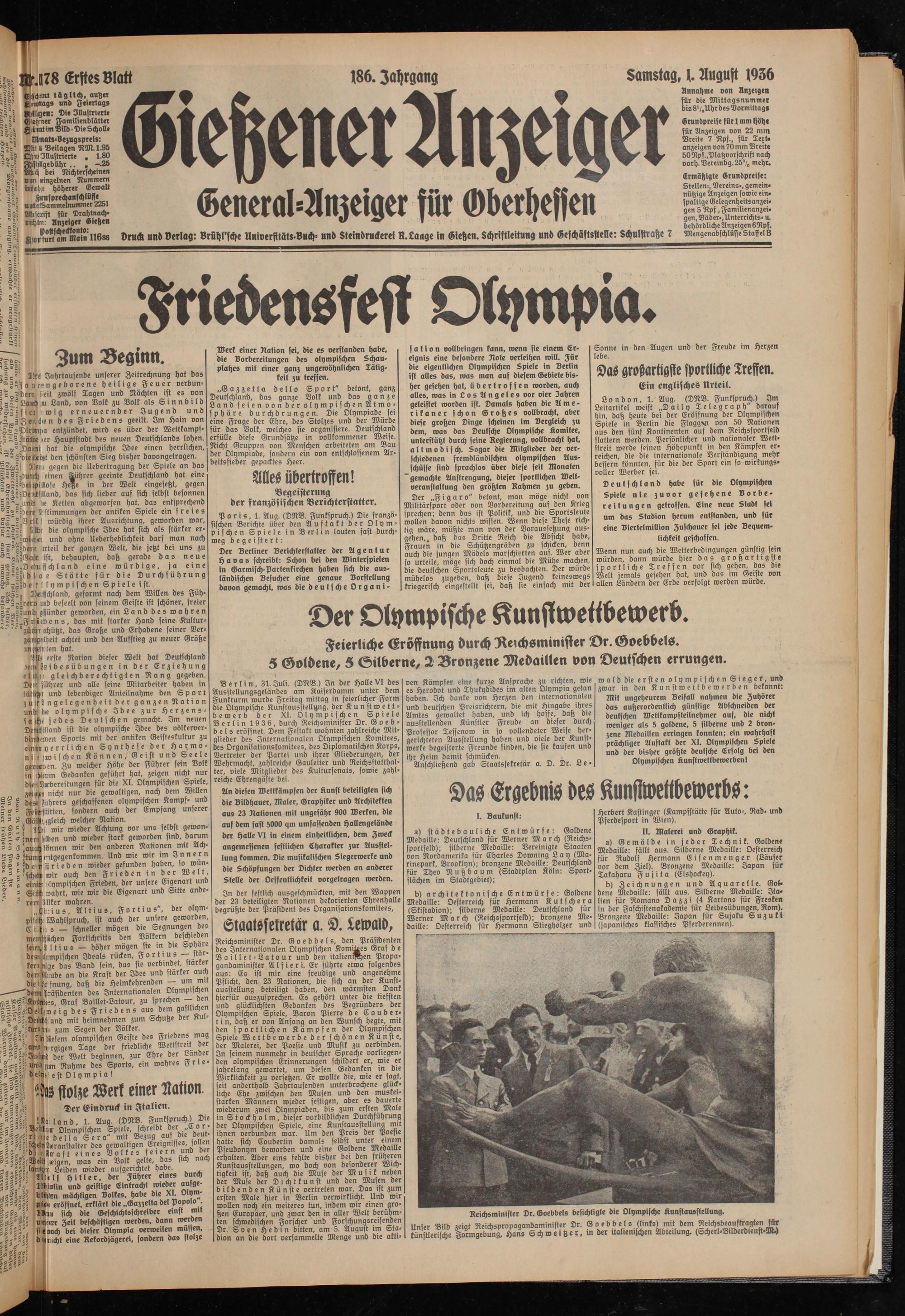 Berlin, 31. Juli. (DNB.) In der Halle VI des Ausstellungsgeländes am Kaiserdamm unter dem Funkturm wurde Freitag mittag in feierlicher Form die Olympische Kunstausstellung, der K u n st w e t t - bewerb der XI. Olympischen Spiele Berlin 1936, durch Reichsminister Dr. G o e b - b e l s eröffnet. Dem Festakt wohnten zahlreiche Mitglieder des Internationalen Olympischen Komitees, des Organisationskomitees, des Diplomatischen Korps, Vertreter der Partei und ihrer Gliederungen, der Wehrmacht, zahlreiche Gauleiter und Reichsstatthalter, viele Mitglieder des Kultursenats, sowie zahlreiche Ehrengäste bei.