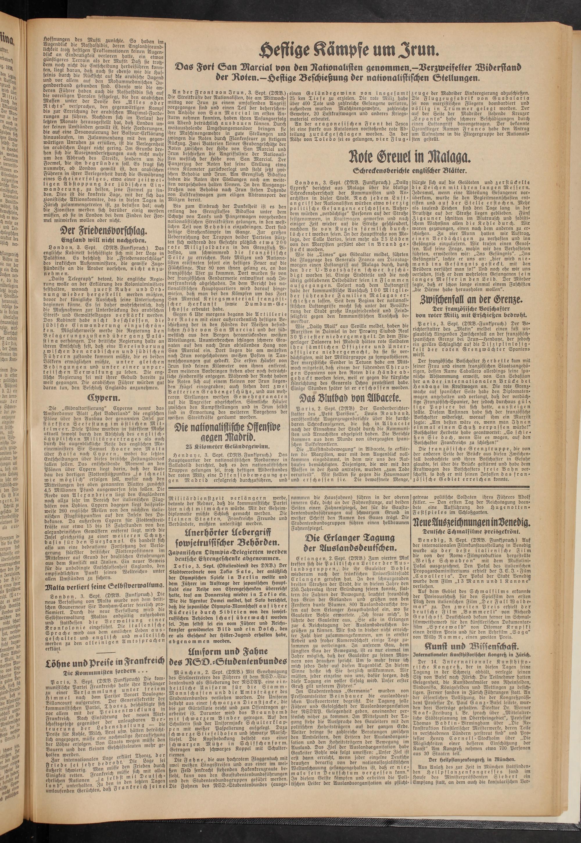 An der Front von Jrun, 3. Sept. (DNB.) Die Streitkräfte der Nationalisten, die am Mittwochmittag vor Jrun zu einem umfassenden Angriff vorgegangen sind und einen Teil der beherrschenden Anhöhe von San Marcial im ersten Ansturm nehmen konnten, haben ihren Anfangserfolg am Abend beträchtlich ausbauen können. Durch weitausholende Umgehungsmanöoer bringen sie ihre Maschinengewehre in gute Stellungen und zwingen die Roten durch Flankenfeuer zu stetigem Rückzug. Zwei Batterien kleiner Grabengeschütze der Roten zwischen der Höhe von San Marcial und Jrun beschießen die Angriffslinie der Nationalisten westlich der Höhe von San Marcial. Der Panzerzug der Roten hat seine Stellung etwa einen Kilometer zurückverlegt und steht jetzt zwischen Behobia und Jrun. Am Grenzfluß Bidassoa haben die Roten ihre Stellungen noch am weitesten vorgeschoben halten können. In den Ausgangsstraßen von Behobia nach Jrun stehen Dutzende von Lastkraftwagen zum eiligen Abtransport der Milizen bereit.