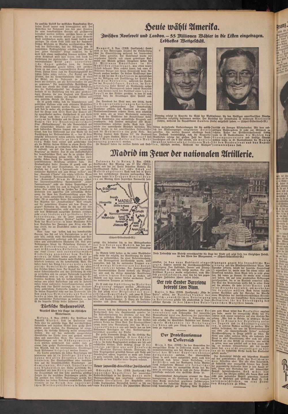 Neuyork, 3. Nov. (DNB. Funkspruch.) Heute wird in den Vereinigten Staaten die Entscheidung über die Staatsführung während der kommenden vier Jahre getroffen. Der Wahlkampf wurde mit ungeheurer Schärfe und einem gewaltigen Aufwand von Mitteln geführt. Insgesamt haben sich 55 Millionen Amerikaner in die Wahllisten eingetragen, was einen neuen Rekord bedeutet. Man rechnet damit, daß etwa 45 Millionen Bürger von ihrem Stimmrecht heute Gebrauch machen werden. In diesem Wahlkampf handelt es sich bei den Demokraten im wesentlichen um die Billigung und Fortführung der Politik des New Deal Roosevelts, wahrend der Kandidat der Republikaner, Landon, die Verurteilung dieser Politik als Wahlparole aufgestellt hat. Am Montagabend haben sowohl Roosevelt als auch Landon durch den Rundfunk einen letzten Appell an ihre Wähler gerichtet, in dem sie noch einmal kurz Die Grundlagen ihrer Politik entwickelten.