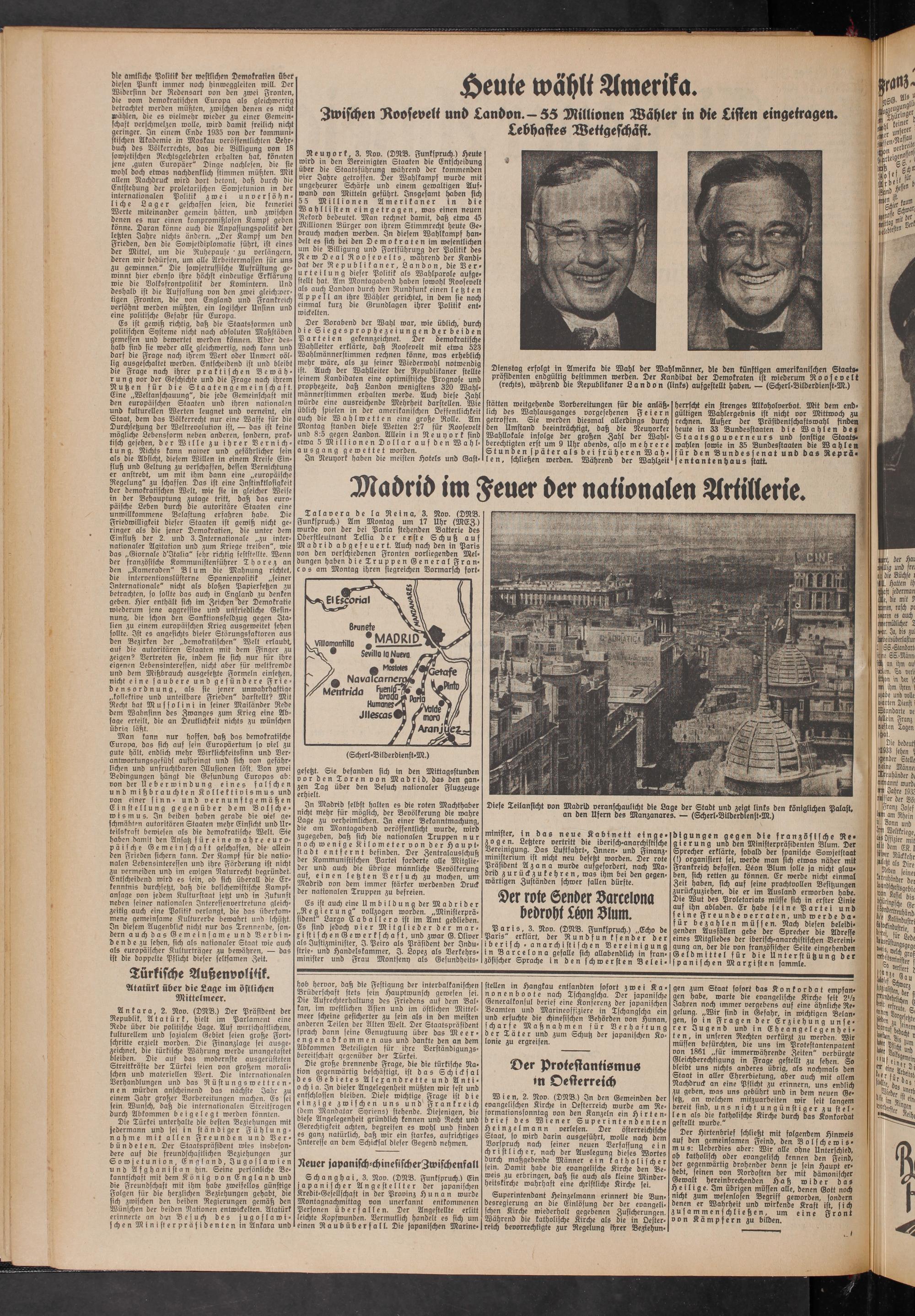 Der Vorabend der Wahl war, wie Üblich, durch die Siegesprophezeiungen der beiden Parteien gekennzeichnet. Der demokratische Wahlleiter erklärte, daß Roosevelt mit etwa 523 Wahlmännerstimmen rechnen könne, was erheblich mehr wäre, als zu seiner Wiederwahl notwendig ist. Auch der Wahlleiter der Republikaner stellte seinem Kandidaten eine optimistische Prognose und prophezeite, daß Landon wenigstens 320 Wahlmännerstimmen erhalten werde. Auch diese Zahl würde eine ausreichende Mehrheit darstellen. Wie üblich spielen in der amerikanischen Oeffentlichkeit auch die Wahlwetten eine große Rolle. Am Montag standen diese Wetten 2:7 für Roosevelt und 8:5 gegen Landon. Allein in Neuyork sind etwa 5 Millionen Dollar a u f den Wahlausgang gewettet worden.