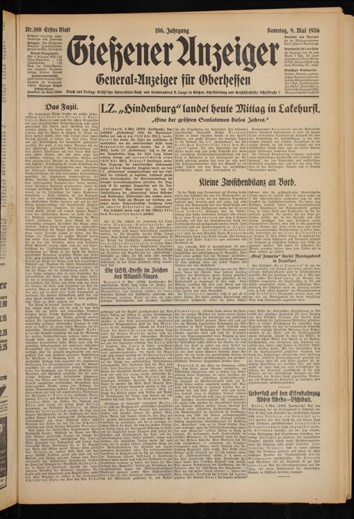 1.2. „Hindenburg" landet heute Mittag in Lakehurst. „Eine der größten Sensationen dieses Jahres."