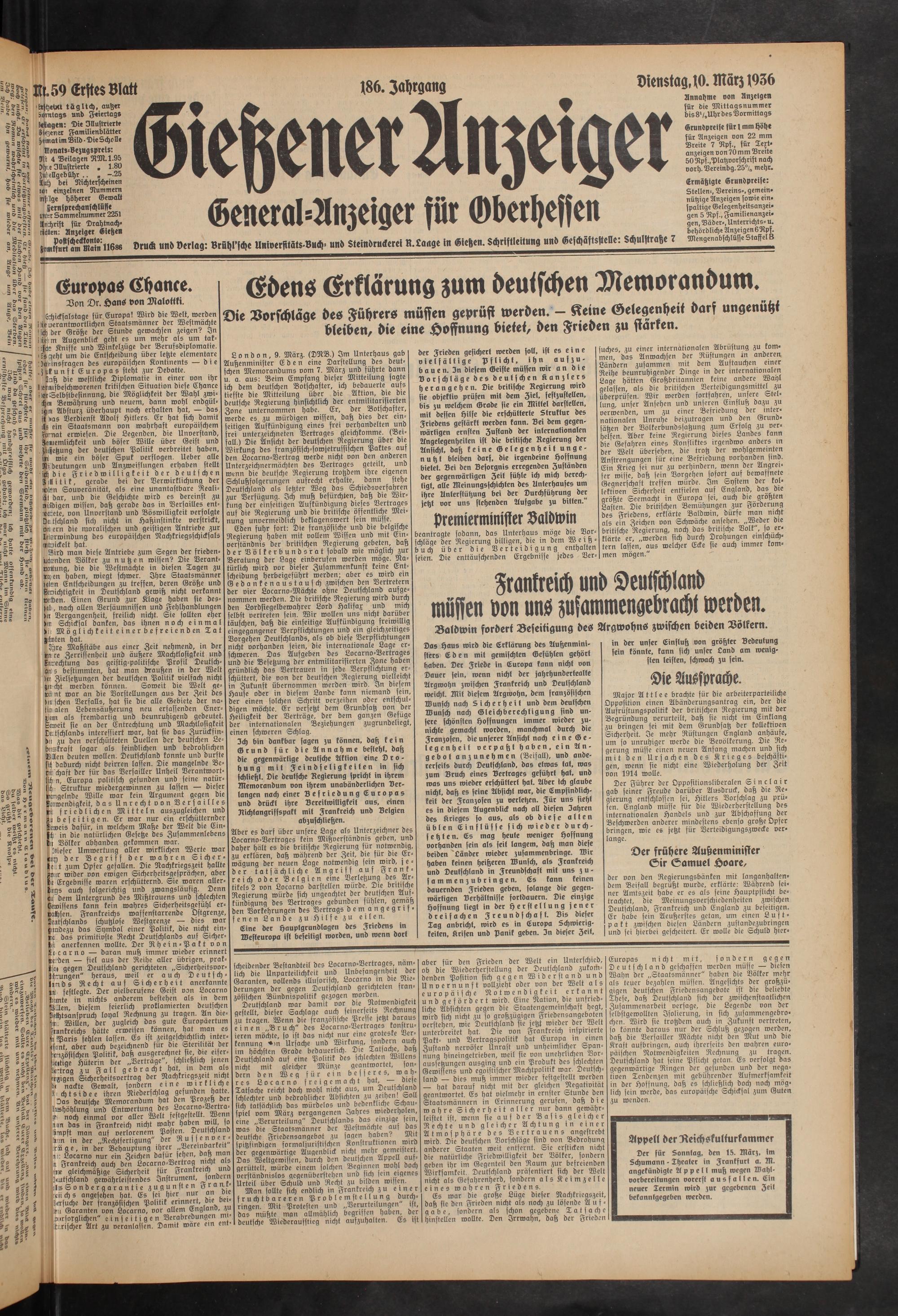 Ich bin dankbar sagen zu können, daß kein Grund für die Annahme besteht, daß die gegenwärtige deutsche Aktion eine Drohung mit Feindseligkeiten in sich schließt. Die deutsche Regierung spricht in ihrem Memorandum von ihrem unabänderlichen Verlangen nach einer Befriedung Europas und drückt ihre Bereitwilligkeit aus, einen Richtangriffspakt mit Frankreich und Belgien abzuschliehen.