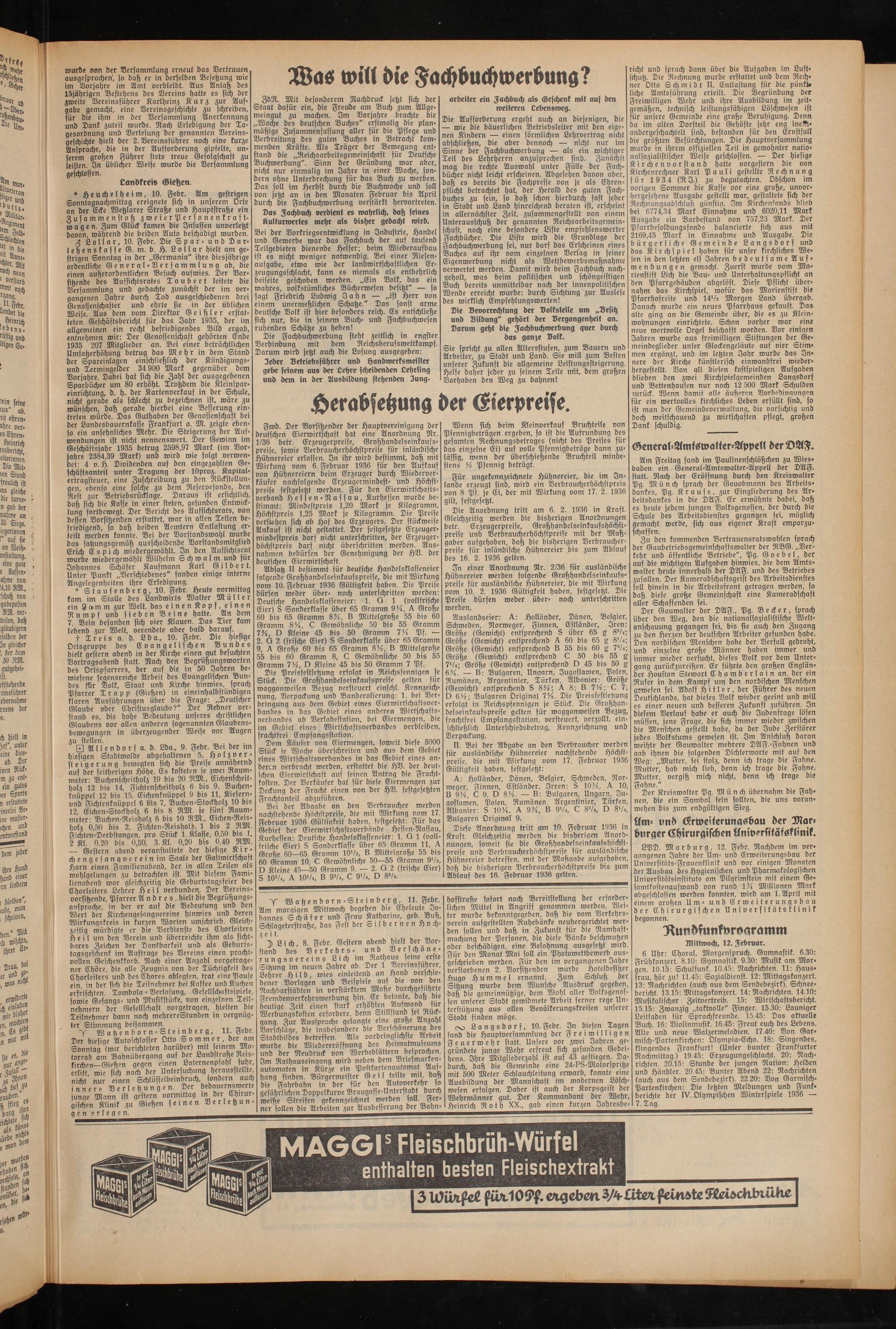 Fwd. Der Vorsitzender der Hauptvereinigung der deutschen Eierwirtschaft hat eine Anordnung Nr. 1/36 betr. Erzeugerpreise, Großhandelseinkaufspreise, sowie Verbraucherhöchstpreise für inländische Hühnereier erlassen. In ihr wird bestimmt, daß mit Wirkung vom 6. Februar 1936 für den Aufkauf von Hühnereiern beim Erzeuger durch Wiederverkäufer nachfolgende Erzeugermindest- und Höchstpreise festgesetzt werden. Für den Eierwirtschafts- verband Hessen-Nassau, Kurhessen wurde bestimmt: Mindestpreis 1,20 Mark je Kilogramm, Höchstpreis 1,25 Mark je Kilogramm. Die Preise verstehen sich ab Hof des Erzeugers. Der stückweise Ankauf ist nicht gestattet. Der festgesetzte Erzeugermindestpreis darf nicht unterschritten, der Erzeugerhöchstpreis darf nicht überschritten werden. Ausnahmen bedürfen der Genehmigung der HV. der deutschen Eierwirtschaft.