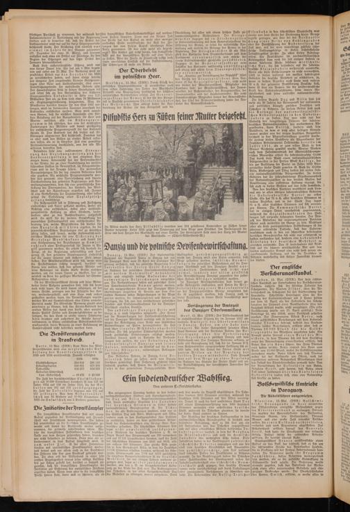 In Wilna wurde das Herz Pilsudskis inmitten von 164 gefallenen Kameraden zu Fußen seiner Mutter beigesetzt. Unser Bild zeigt den Trauerzug auf dem Wege zum Friedhof. Im Vordergrund tue Urne mit dem Herzen des Marschalls auf einer Sänfte. Im Hintergrund sieht man den Sarg der Mutter des Marschalls. — (Scherl-Bilderdienft-M.)