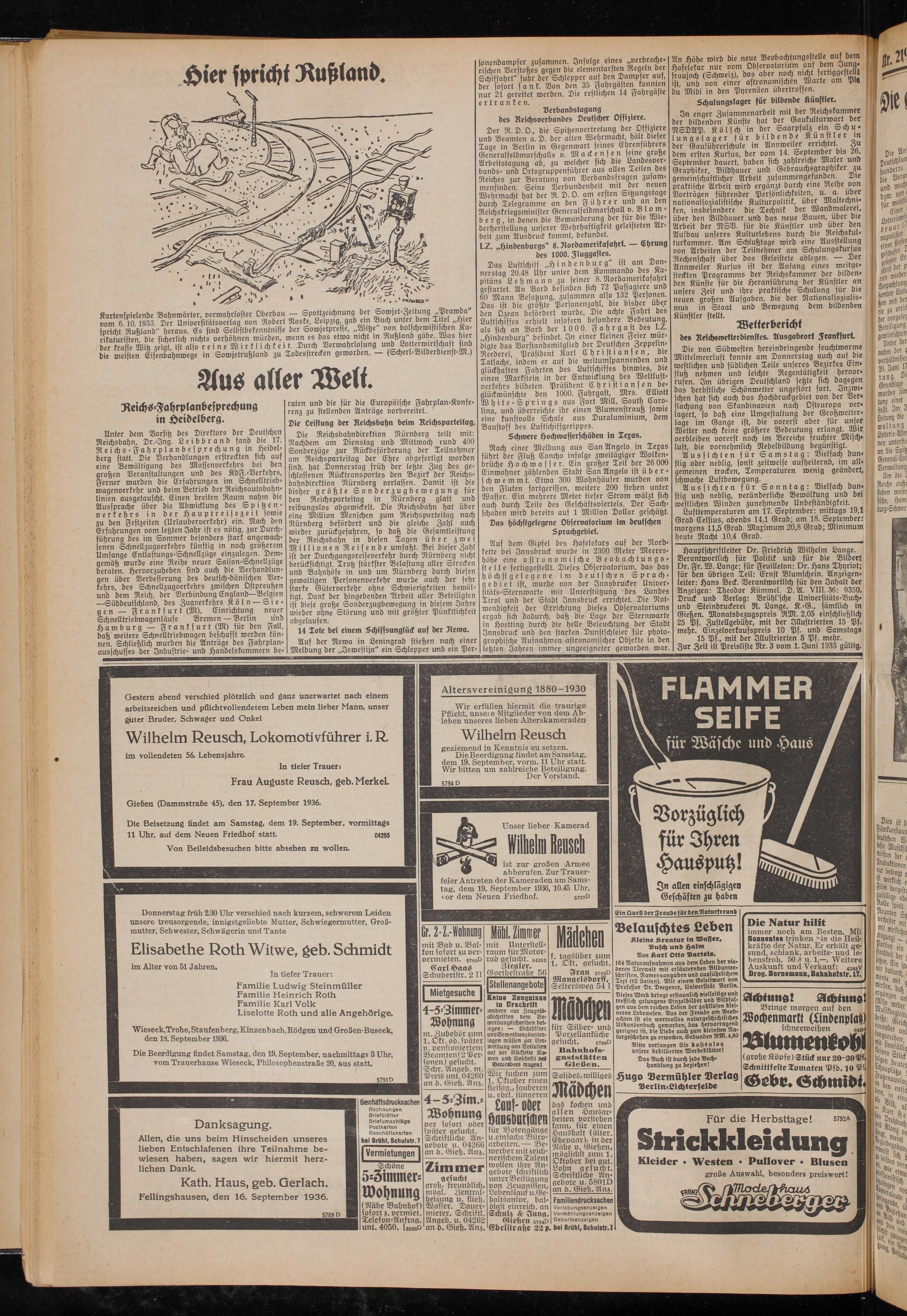 Hauptschriftleiter Dr. Friedrich Wilhelm Lange. Verantwortlich für Politik und für die Bilder; Dr. Fr. W. Lange; für Feuilleton: Dr. Hans Thyriot; für den übrigen Teil: Ernst Blumfchein. Anzeigen- (eiter: Hans Beck. Verantwortlich für den Inhalt der Anzeigen: Theodor Kümmel. D. A. VIII. 36: 9350. Druck und Verlag: Brühl'sche Universitäts-Buch- und Steindruckerei R. Lange, K.-G., sämtlich in Gießen. Monatsbezugspreis RM. 2,05 einschließlich 25 Pf. Zustellgebühr, mit der Illustrierten 15 Pf. mehr. Einzelverkaufspreis 10 Pf. und Samstags
